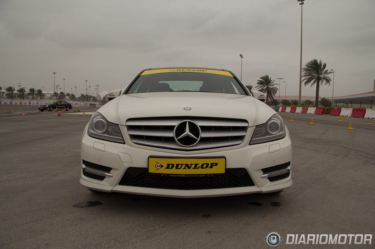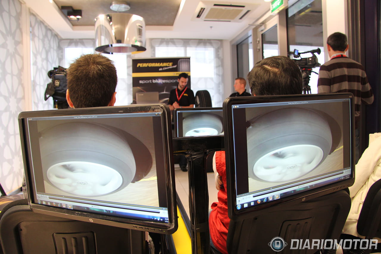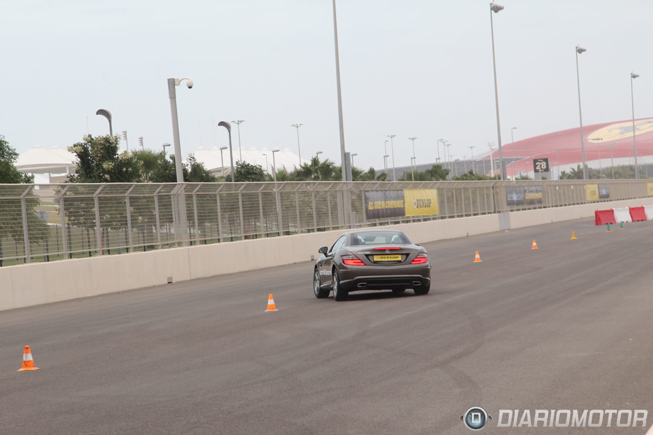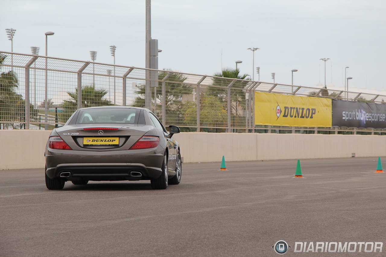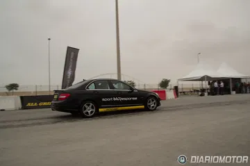 La primera prueba que realizamos consistía en un pequeño circuito con curvas en seco y mojado. A bordo de un Mercedes Clase C pudimos comprobar el buen agarre en ambos casos. Realmente es fácil determinar si un neumático agarra bien o no: basta con coger una curva cerrada en mojado a una velocidad que nunca haríamos en carretera. Si el neumático derrapa (y el ESP salta), el agarre no sería del todo bueno. Si por el contrario se produce un subviraje leve y progresivo, y por tanto controlable, podemos decir que el neumático está actuando de forma correcta.