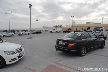 La caravana de Mercedes Clase C con la silueta del skyline de Abu Dhabi al fondo