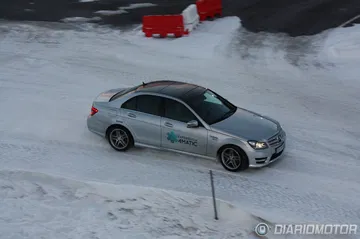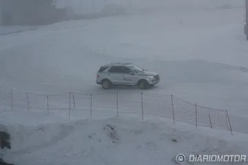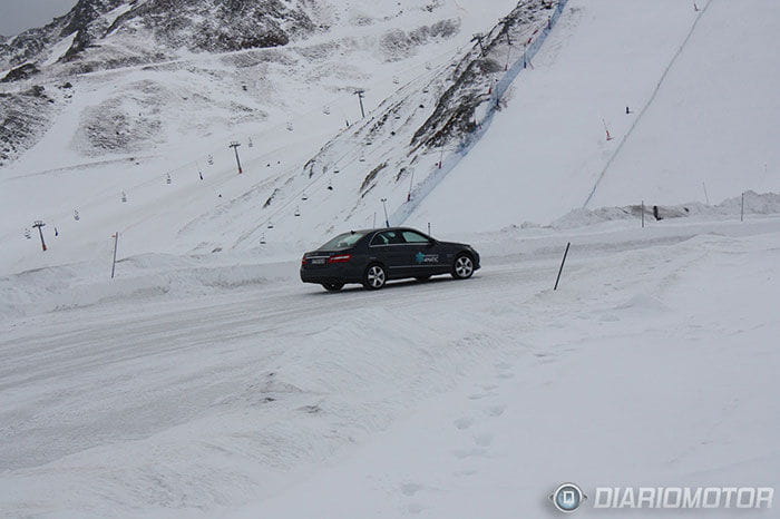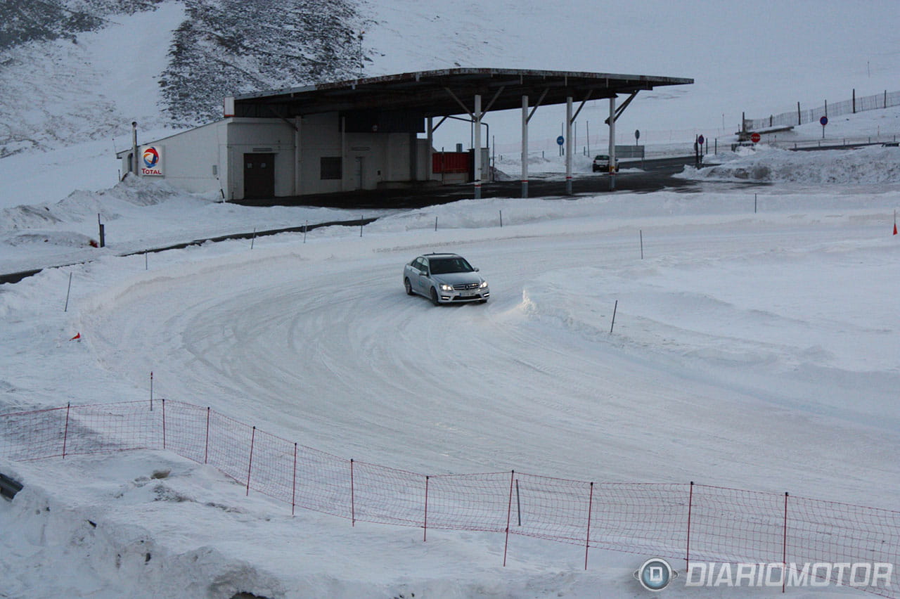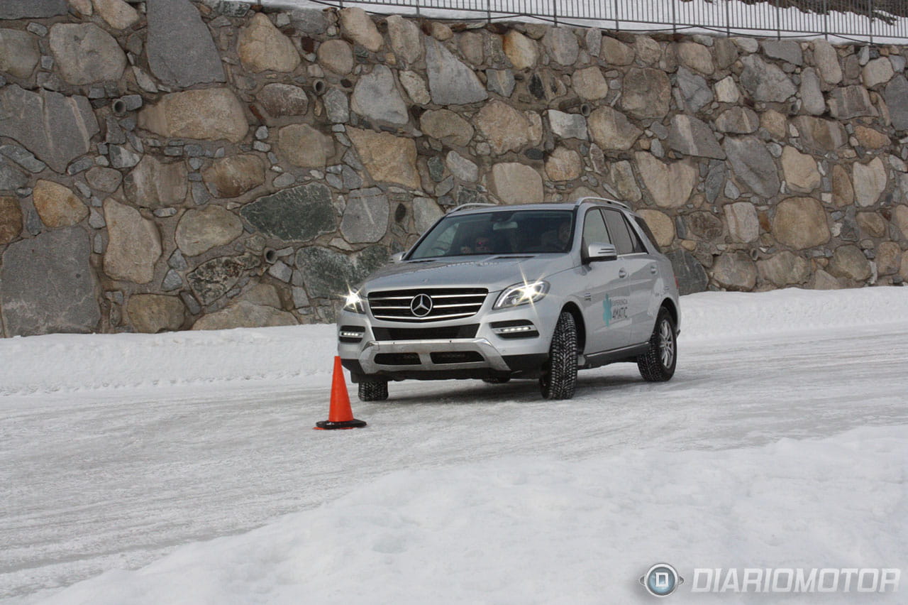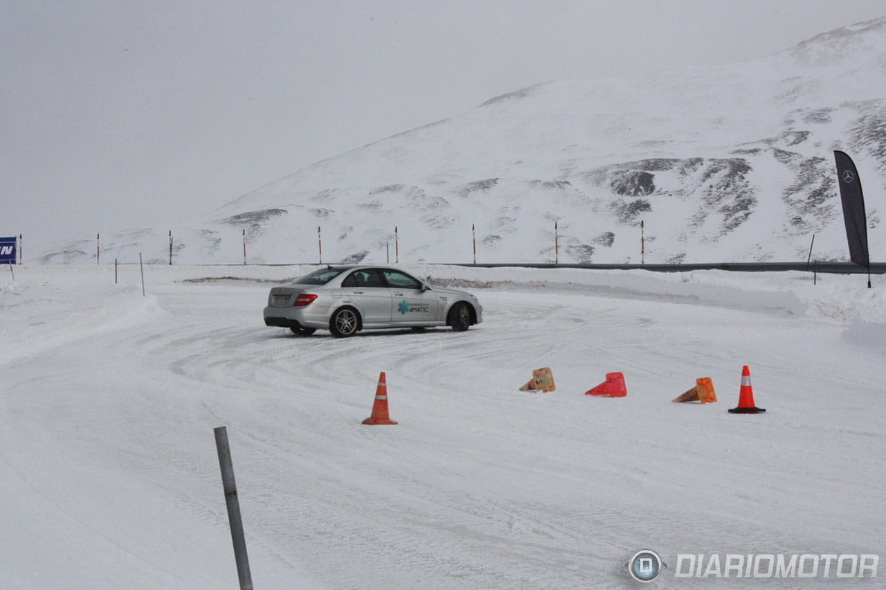 Esto lo pudimos comprobar con un Clase C familiar y una cuesta de unos 15º de ángulo con nieve y hielo en uno de los laterales. Nada más comenzar a ascender y tocar la nieve los neumáticos comenzaron a patinar y todos los asistentes electrónicos del Mercedes comenzaron a trabajar para tratar de ganar adherencia, esencialmente controlando la potencia derivada a cada una de las ruedas a base de redistribuir la energía.
