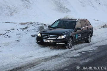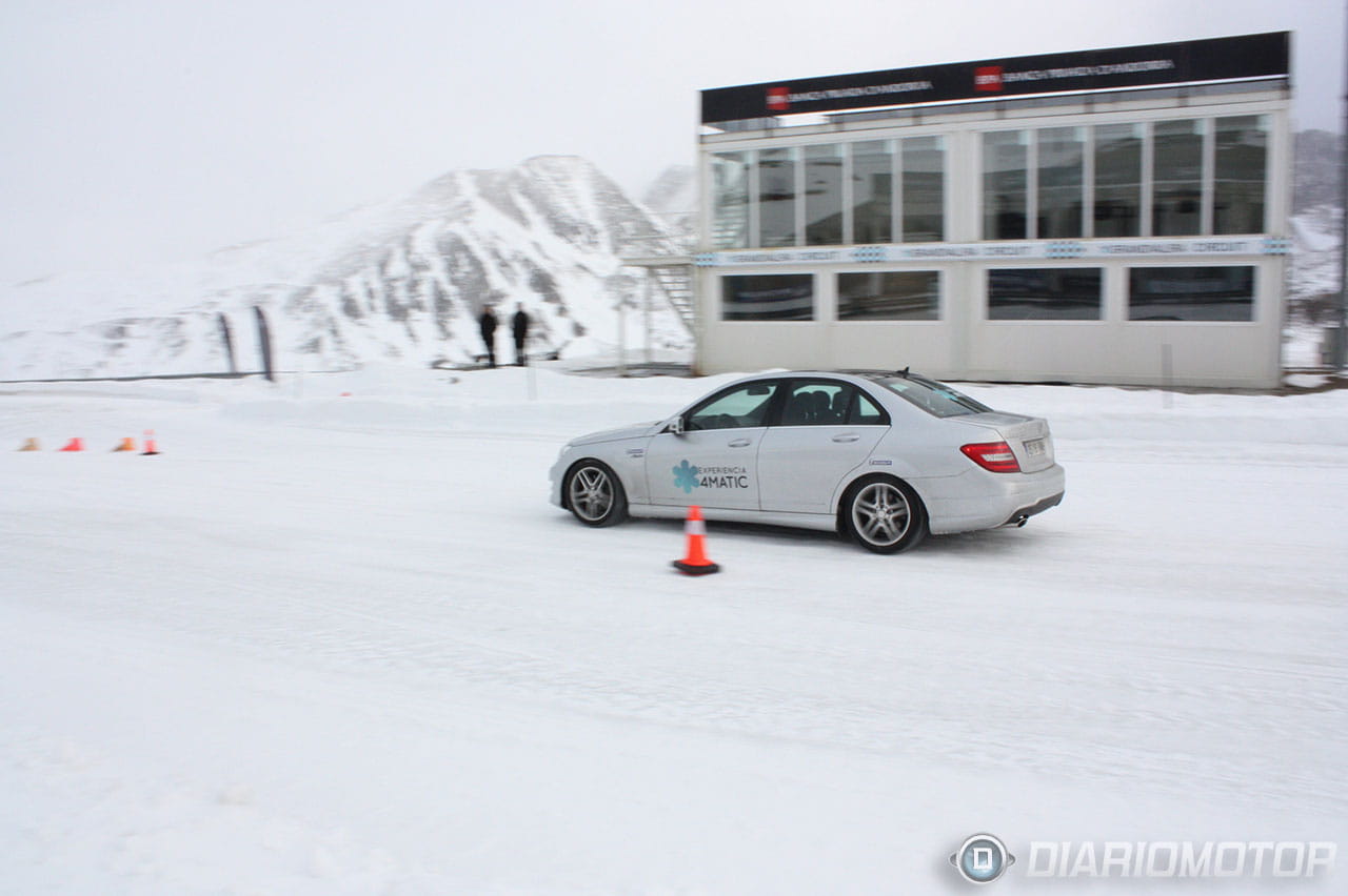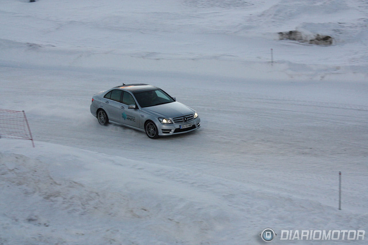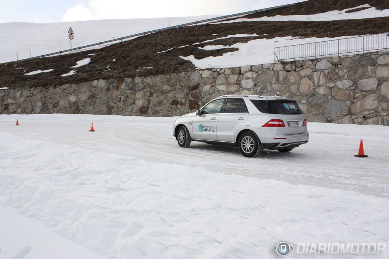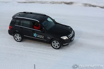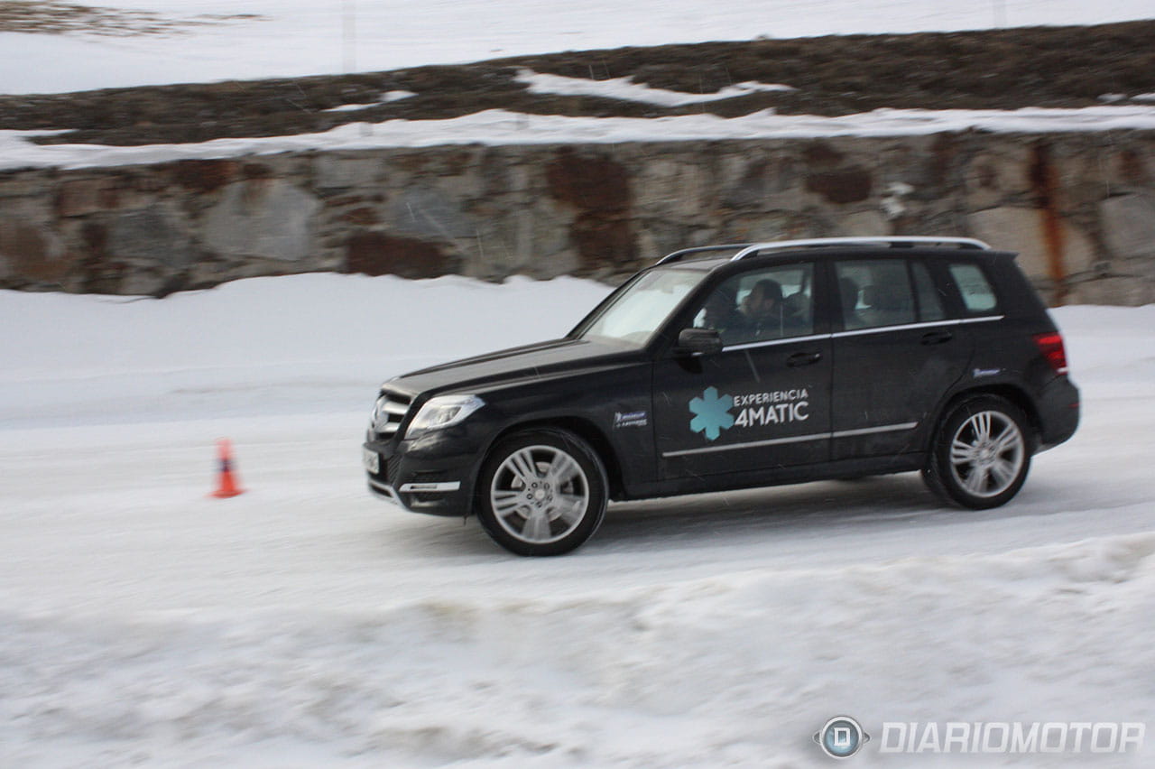 Esto lo pudimos comprobar con un Clase C familiar y una cuesta de unos 15º de ángulo con nieve y hielo en uno de los laterales. Nada más comenzar a ascender y tocar la nieve los neumáticos comenzaron a patinar y todos los asistentes electrónicos del Mercedes comenzaron a trabajar para tratar de ganar adherencia, esencialmente controlando la potencia derivada a cada una de las ruedas a base de redistribuir la energía.