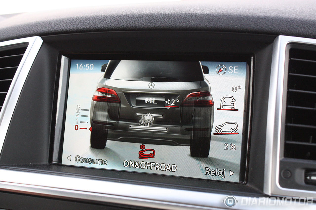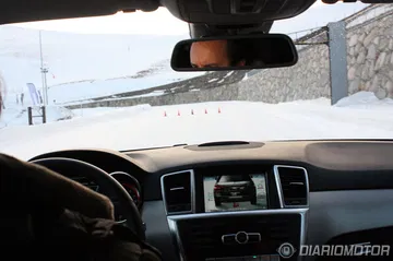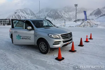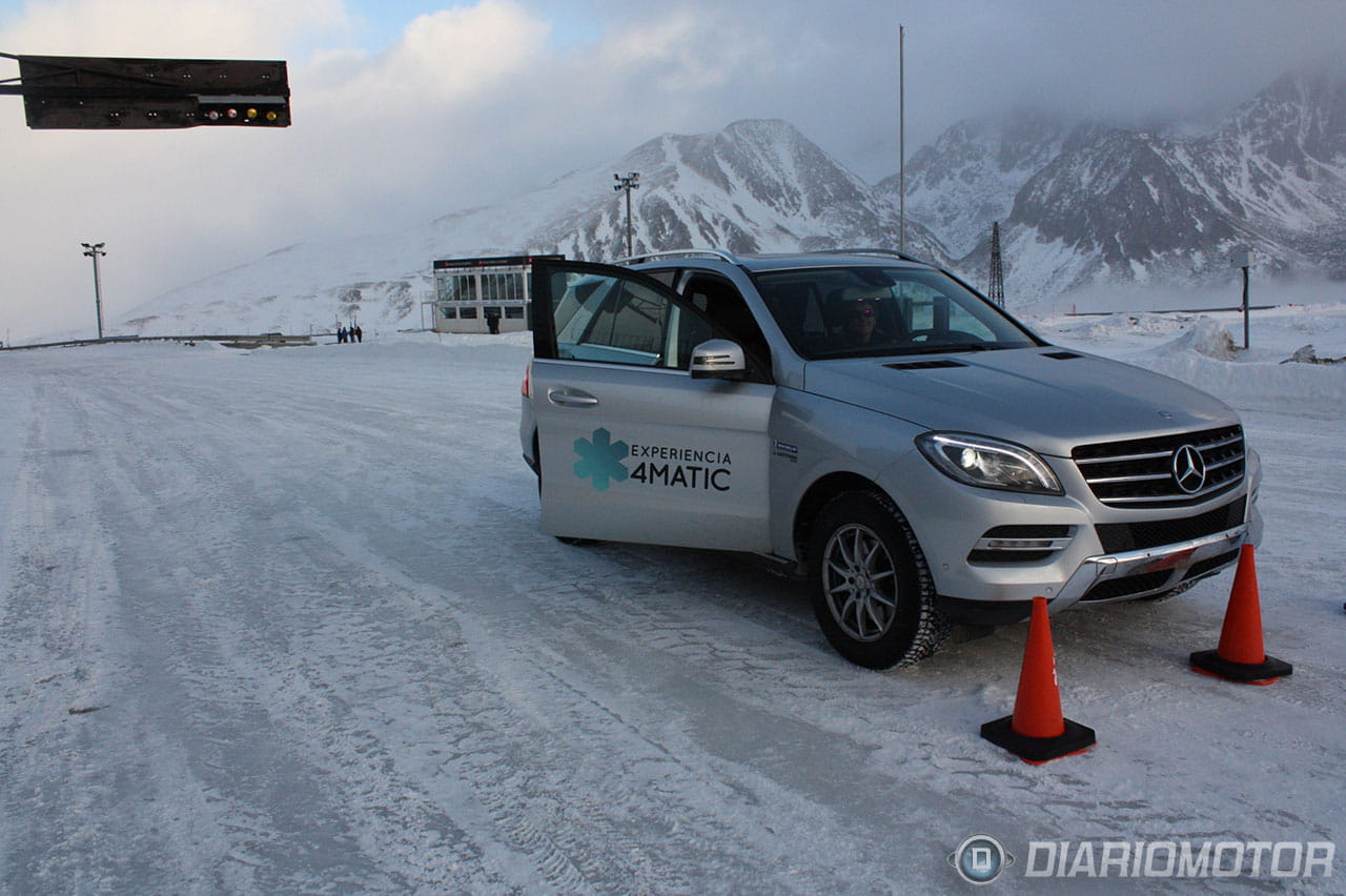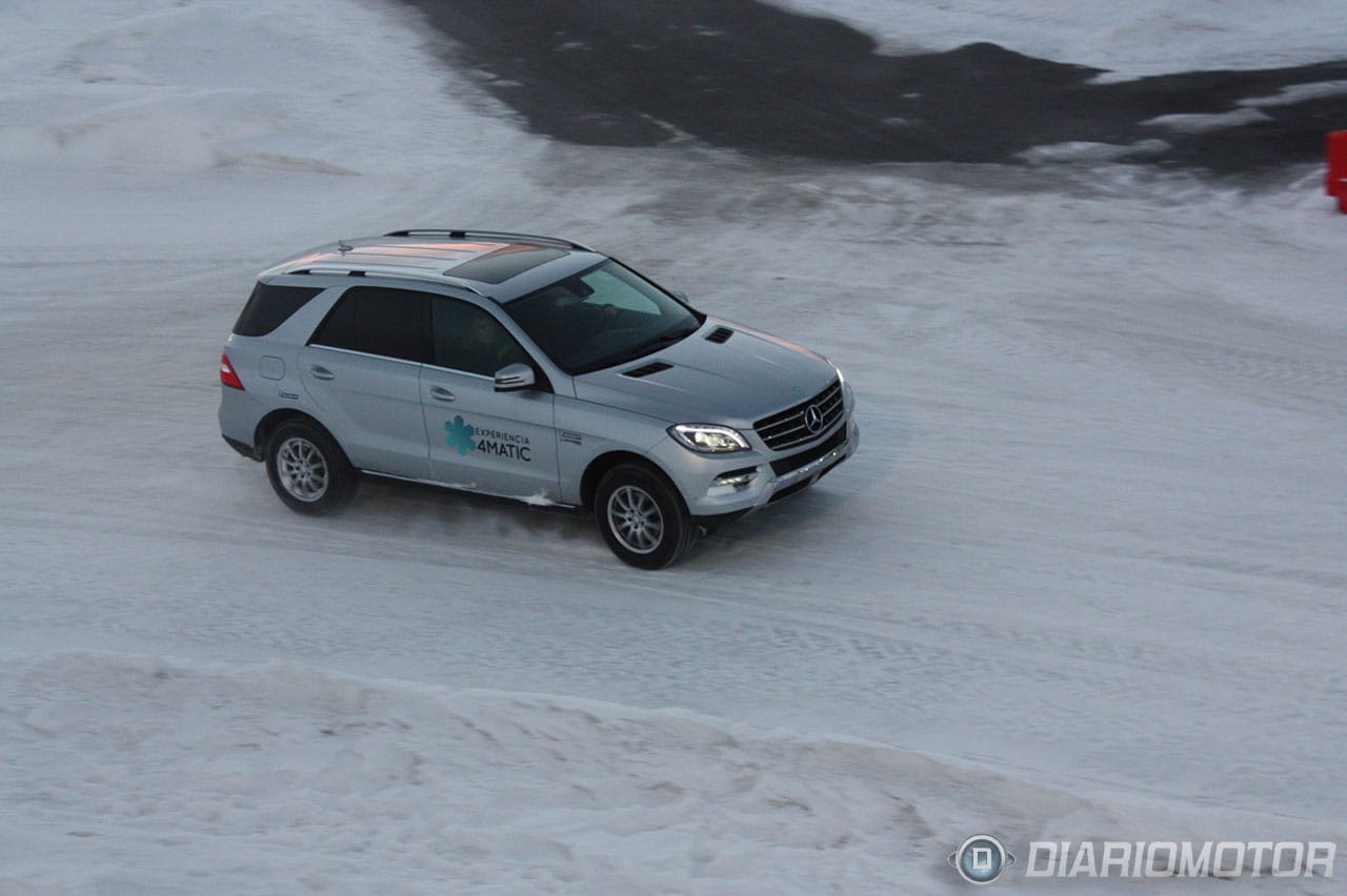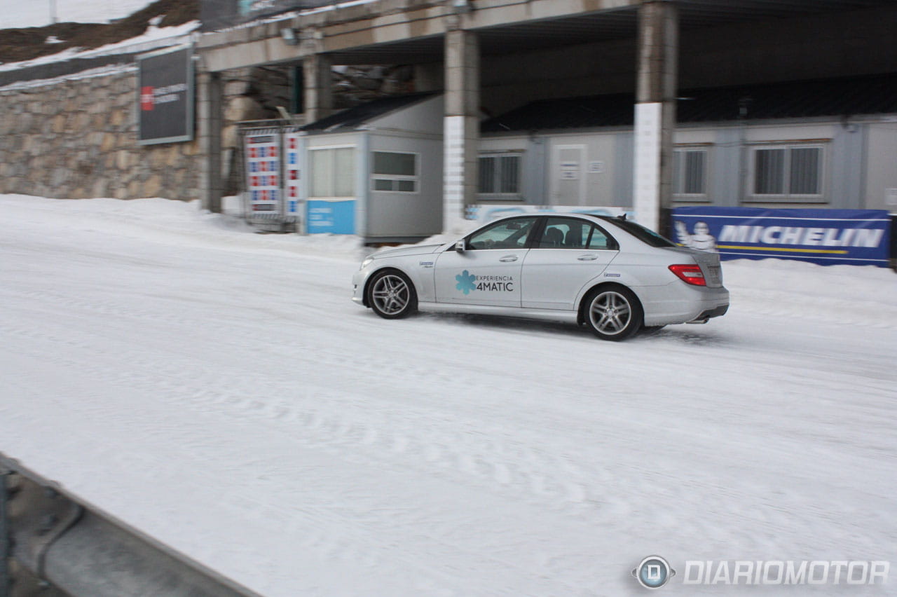 Esto lo pudimos comprobar con un Clase C familiar y una cuesta de unos 15º de ángulo con nieve y hielo en uno de los laterales. Nada más comenzar a ascender y tocar la nieve los neumáticos comenzaron a patinar y todos los asistentes electrónicos del Mercedes comenzaron a trabajar para tratar de ganar adherencia, esencialmente controlando la potencia derivada a cada una de las ruedas a base de redistribuir la energía.