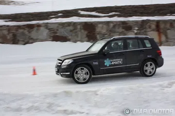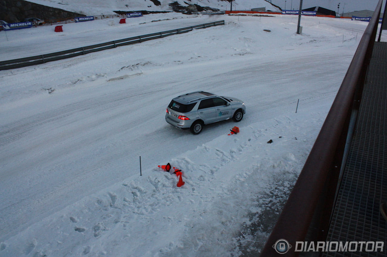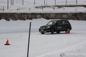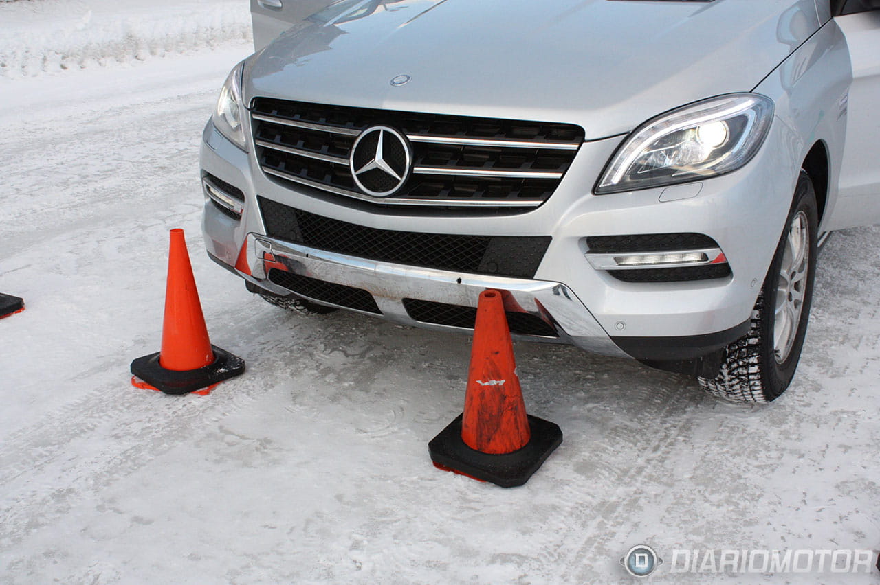 Si con un coche relativamente bajo y “poco” pesado como un Clase C resulta sencillo perder la adherencia, porque los neumáticos de invierno ayudan pero no hacen milagros, si se los ponemos a un SUV de más de dos toneladas y un centro de gravedad más alto la cosa se complica. Con un Mercedes GLK realizamos una prueba de slalom, sorteando conos por la izquierda y por la derecha, en una zona con mucho hielo.