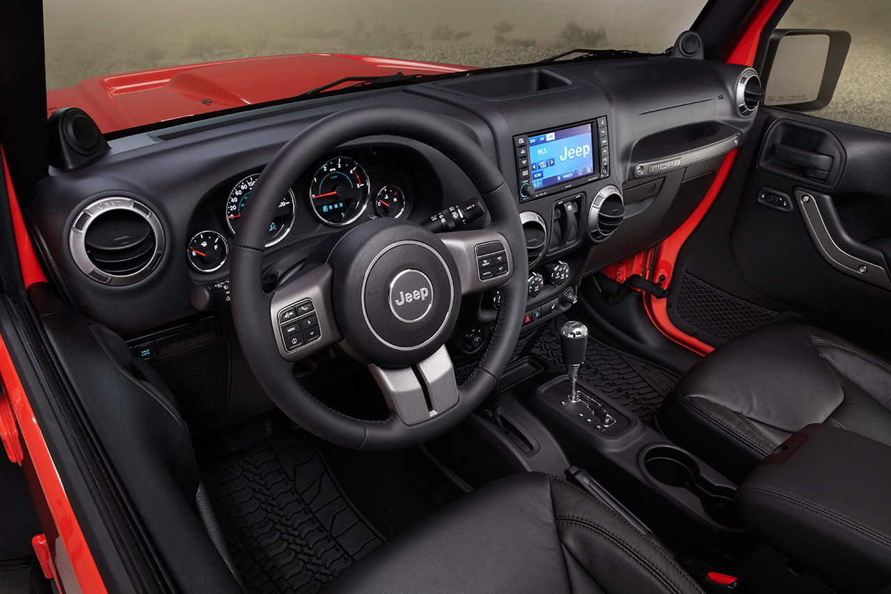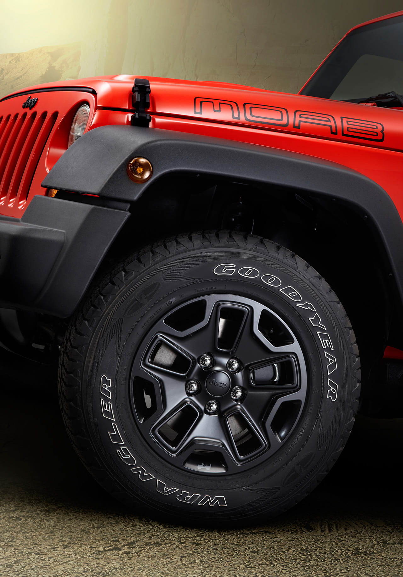 El Jeep Wrangler Moab cuenta con adhesivos sobre el capó, unas llantas exclusivas de 17” con neumáticos Goodyear 245/75 R17, protecciones adicionales, asientos tapizados de cuero negro, tapa del depósito de combustible de color negro con diseño de MOPAR, capó con joroba y eje trasero con diferencial anti-deslizamiento Trac-Loc, diseñado para mejorar la tracción sobre terrenos muy deslizantes como arena, grava, nieve y hielo.