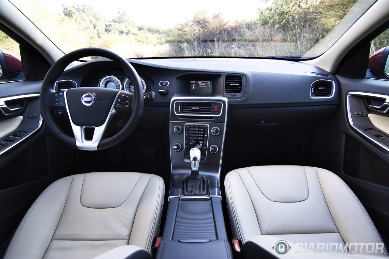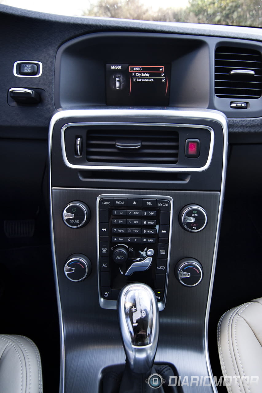 Sin duda la calidad interior y la comodidad son dos de los mejores puntos del Volvo S60. Al mencionado agradable tacto de los botones de la consola central se le suma un diseño que siguiendo con la línea de su exterior se muestra muy limpio, pero al mismo tiempo acogedor. El interior del Volvo S60 llama la atención por la práctica ausencia de elementos que rompan con la línea del salpicadero. 3 aireadores de diseño cuadrado, uno rectangular sobre la pantalla a color situada en el centro del salpicadero y bajo esta la consola central.