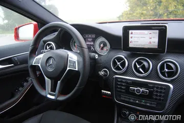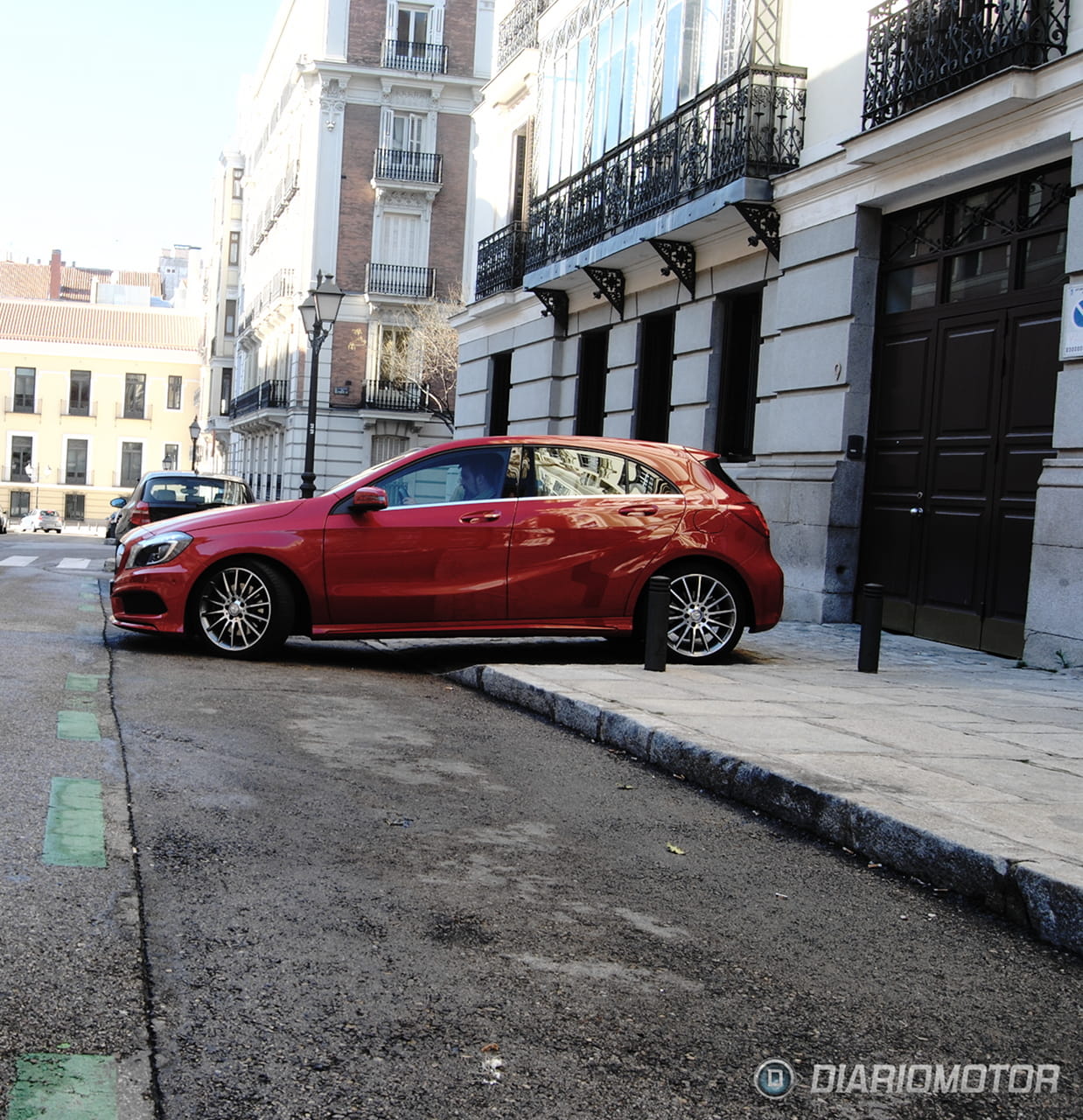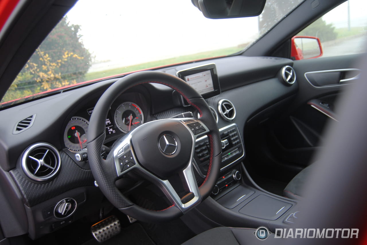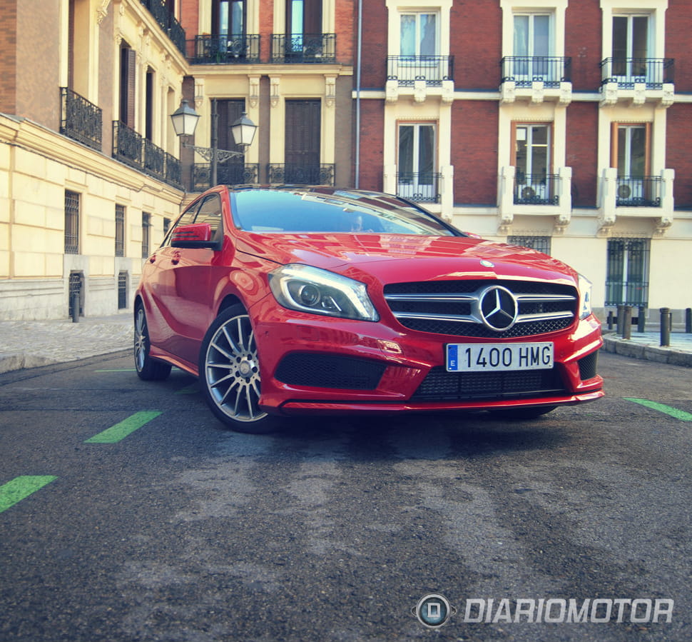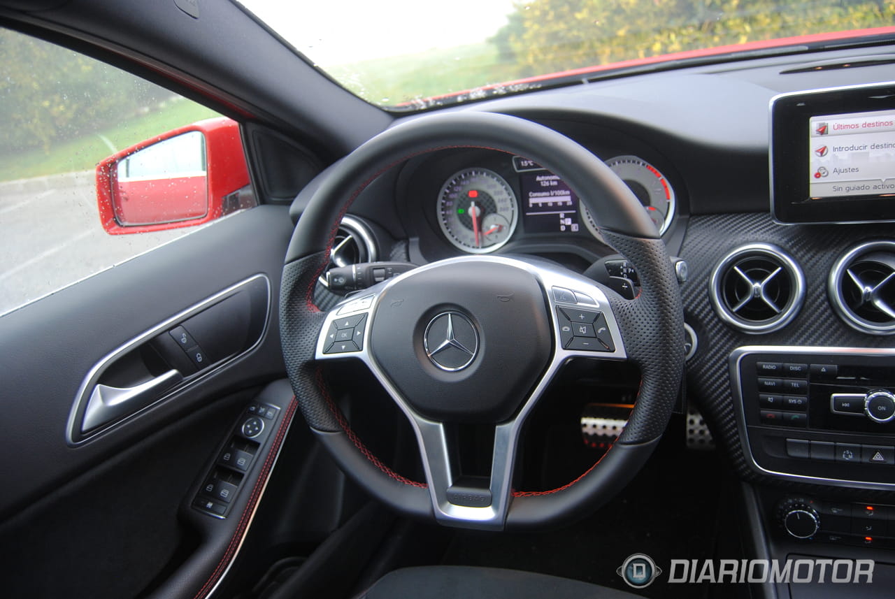 Me gusta el diseño del Mercedes Clase A. Me gusta, lo decía al comienzo del segundo párrafo de este apartado, lo vuelvo a decir ahora antes de meternos en su interior y lo volveré a decir a lo largo de la prueba. Me gusta tal y como está esta unidad. En rojo, un tono que le sienta a la perfección por la línea, resaltando los nervios y por el carácter, más deportivo, más juvenil. Con el paquete AMG, con esos paragolpes, con las taloneras y sobre todo con esas llantas multiradio. Me gusta en definitiva el aspecto del Mercedes Clase A. Me gusta más que el Audi A3 o que el BMW Serie 1, por supuesto, es una cuestión personal y los otros dos alemanes sobresalen por encima del Mercedes en determinados aspectos. Pero a mí, me ha ganado el Clase A con su diseño, ¿y qué pasa con su interior?