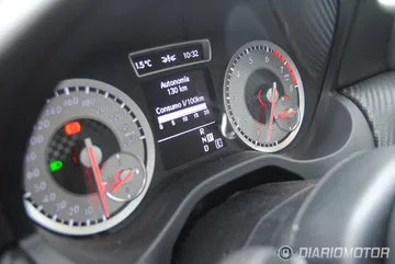 Ante nosotros, una combinación de cuero, costuras rojas y apliques en símil de aluminio en un volante achatado. Tras él, una acertada instrumentación de esferas blancas a ambos lados de la pantalla del ordenador de a bordo. Buen diseño el de las esferas en blanco, con los números también en blanco contrastado y el toque de fibra de carbono de la parte central.
