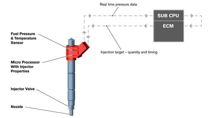 El ciclo de combustión diésel, en el apartado referente a la inyección, tan sólo necesita del control de cuatro variables: presión de inyección, caudal de combustible, tiempo de inyección y temperatura del gasóleo para determinar el volumen. Las tres variables últimas se consiguen mediante múltiples sensores ubicados en diferentes emplazamientos de circuito de alimentación, sin embargo, la presión absoluta cercana a los 2.500 bares en la actual generación de la tecnología, tan sólo era medida en la propia rampa de inyección como un factor común a todos los inyectores conectados.