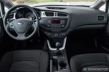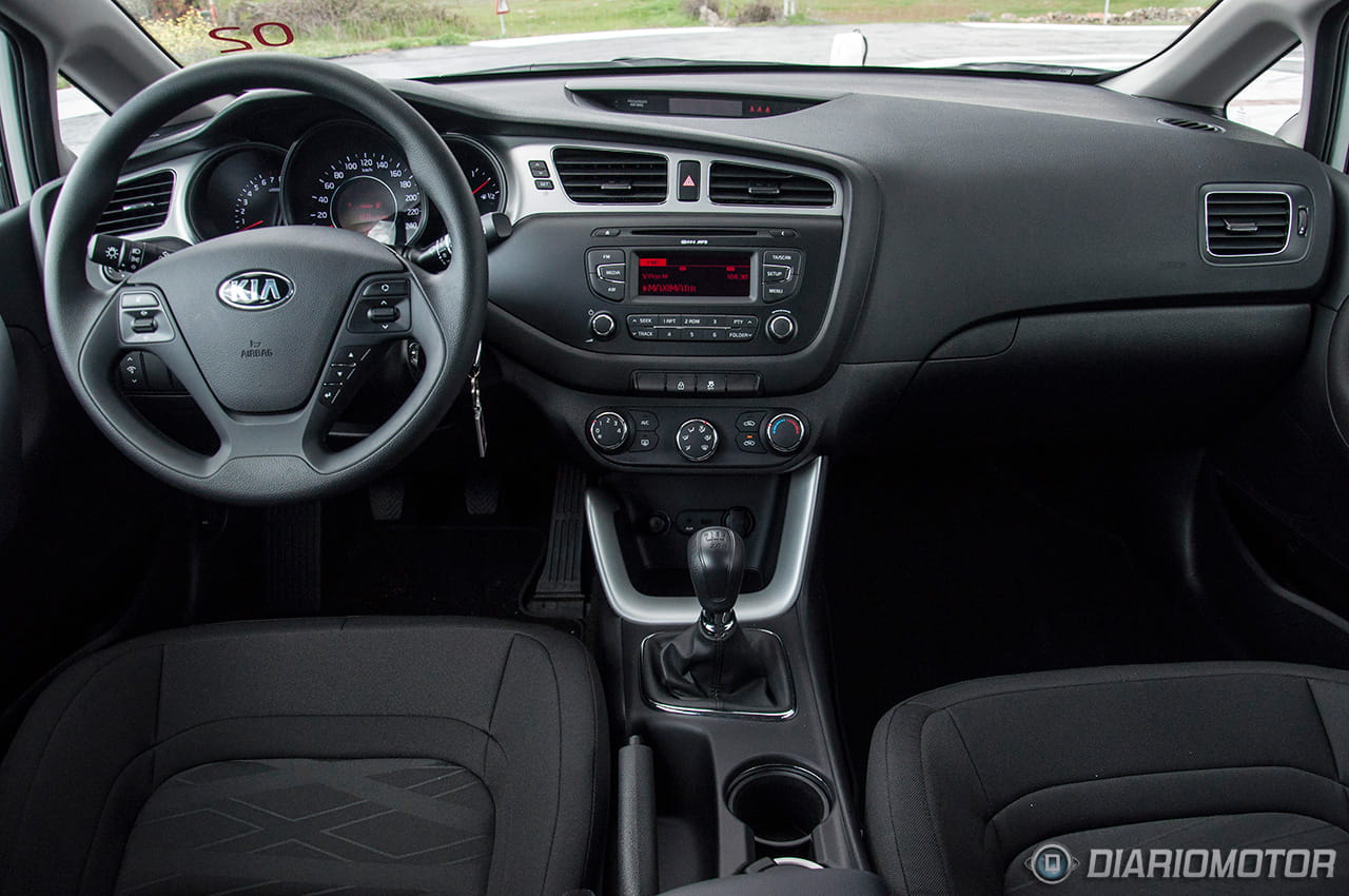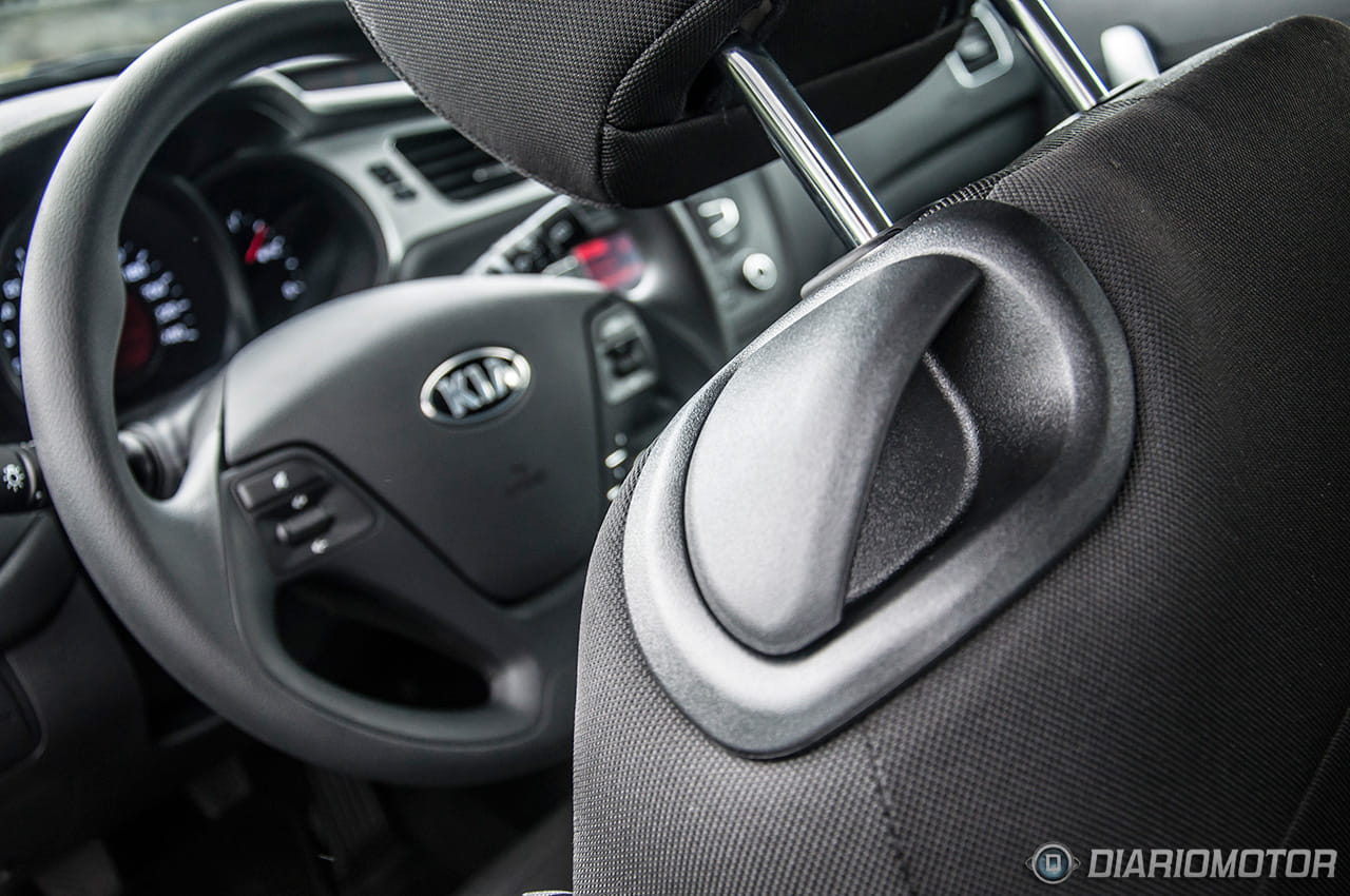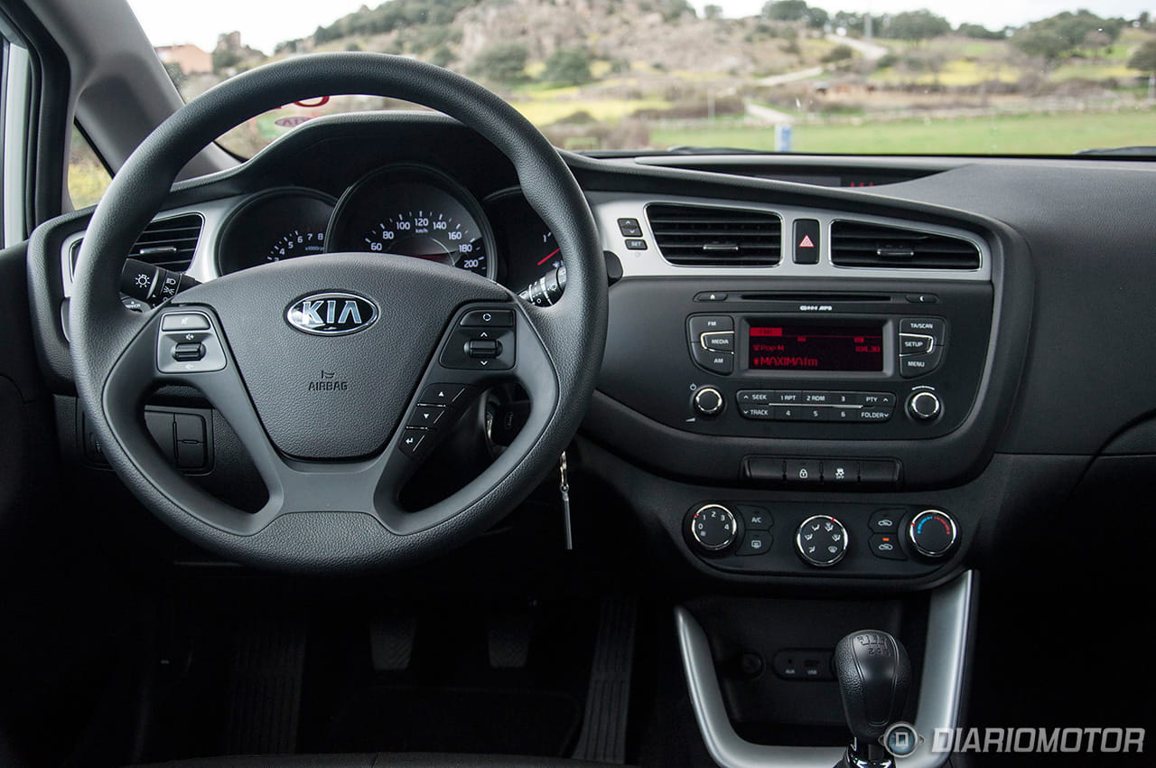 Aunque el tapacubos [foto] del modelo de la entrada de la gama Kia pro_cee’d sea realmente bonito, no deja de ser un detalle pobre que no podremos subsanar ni tan siquiera con unas llantas como extra opcional. El acabado Concept solo está disponible con los motores más básicos, el 1.4 CVVT de 100 CV (que solo puede optar a este acabado) y el 1.6 CRDi de 110 CV que con acabado Drive cuesta aproximadamente 1.500 euros más. Los materiales empleados, desde este modelo más básico, son muy aceptables, y el habitáculo, aunque sencillo, está bien rematado. Cuenta con unos asientos de tela bastante sencillos y ni el volante [foto] ni el pomo del cambio están revestidos con piel. Lo bueno es que desde el Concept, salvo por los sensores de presión de neumáticos y la ayuda de mantenimiento de carril, ya contamos con toda la dotación de seguridad existente.