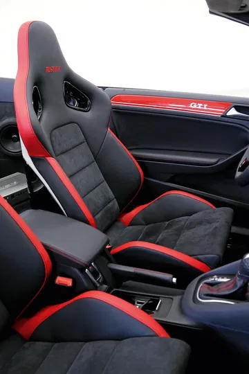 Ambos asientos llevan bordada la palabra AUSTRIA, mientras que en los paneles de las puertas nos encontramos unas inserciones en plástico rojo con las letras GTI serigrafiadas. Por lo demás, los asientos traseros se han eliminado para dar cabida a un impresionante equipo de sonido de once altavoces y 2.250 W de potencia.