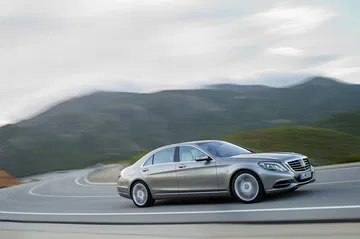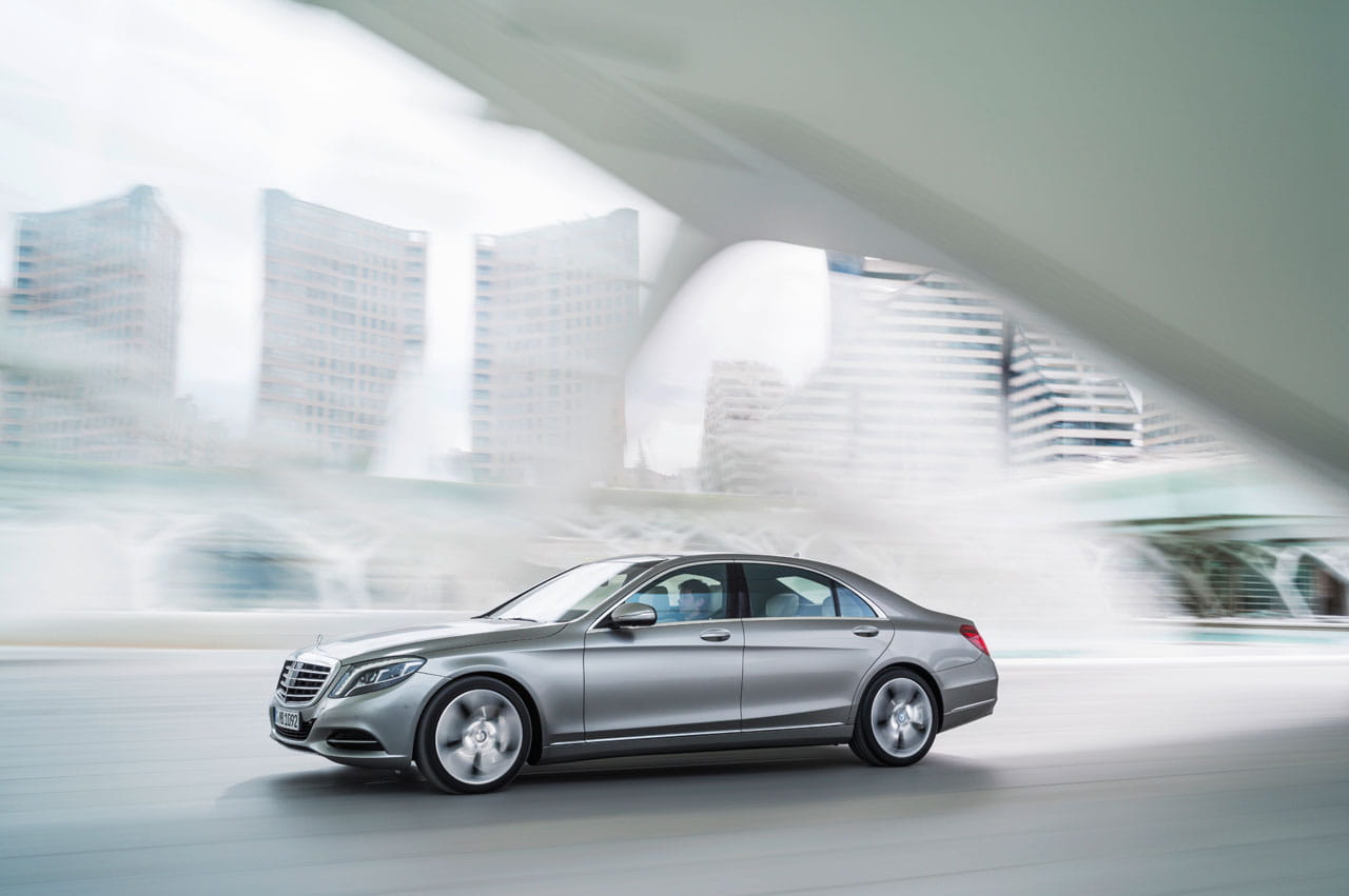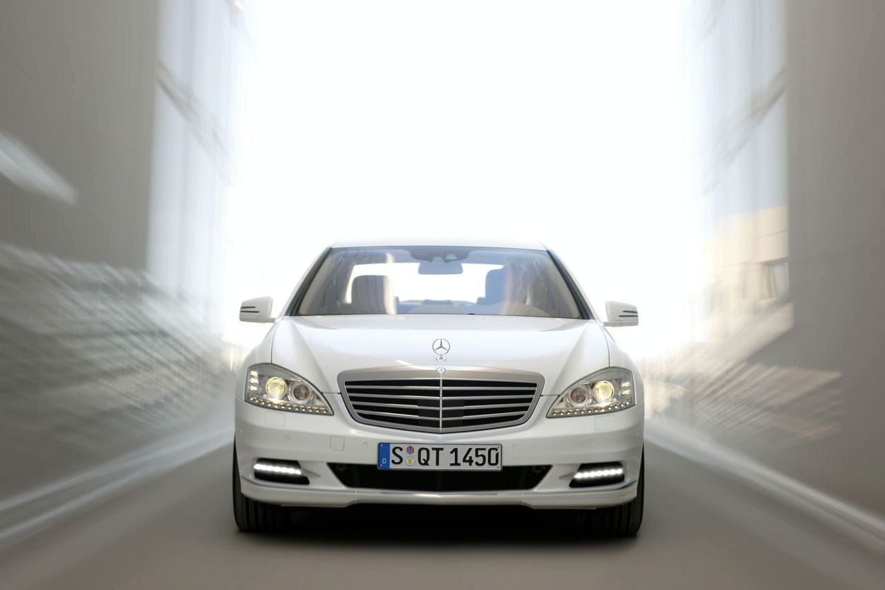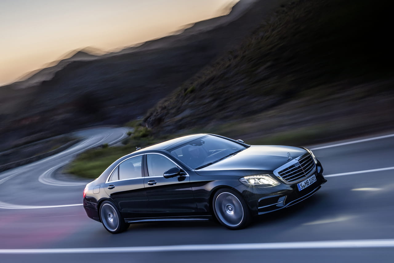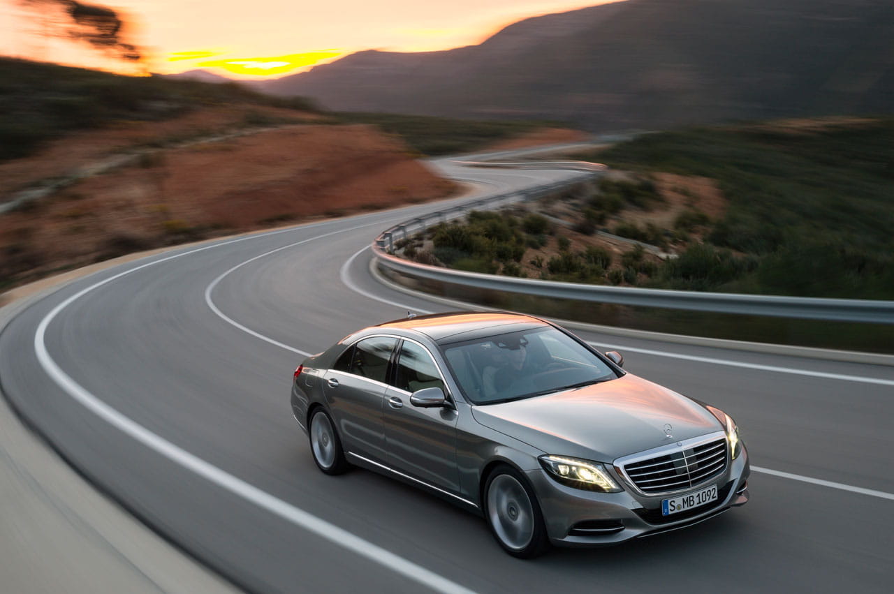 Vista delantera y lateral del Mercedes Clase S en carretera