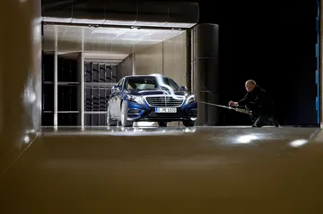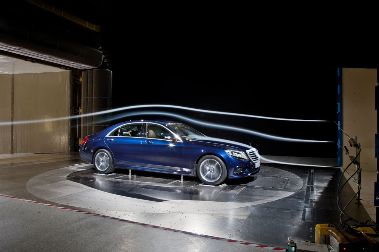 Como ya pudimos ver en el Mercedes CLA, la aerodinámica tiene un papel fundamental en el diseño de la berlina. Si la berlina compacta derivada del Mercedes Clase A podía hacer alarde del mejor coeficiente aerodinámico en un coche de producción, con un Cx de 0.22, el buque insignia de la firma hace lo propio en el segmento, consiguiendo el mejor coeficiente de la categoría con un Cx de 0.24, que en la variante híbrida se reduce hasta un Cx de 0.23, jugando un papel fundamental en este hito el nuevo túnel de viento de Sindelfinguen.