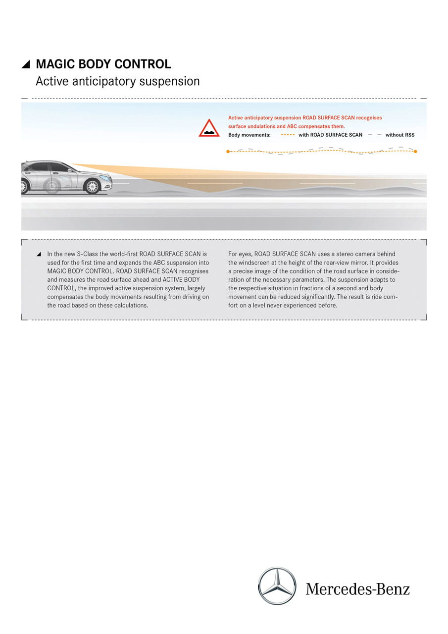 Podemos definir al Mercedes Clase S como un cúmulo de innovaciones (en seguridad, en confort, en aerodinámica…) envuelto todo en un cuidado envoltorio. Entre las novedades técnicas presentes en el nuevo Mercedes Clase S nos encontramos con tecnologías como el Magic Body Control, sistema, que a través de unas cámaras montadas sobre el parabrisas delantero monitoriza el estado de la carretera para adaptar a esta situación del firme la suspensión, buscando ofrecer la mejor absorción, los más mínimos balanceos en lo que podríamos considerar una de las suspensiones más evolucionadas del mercado.