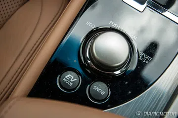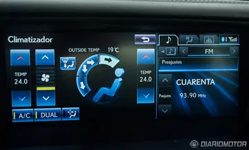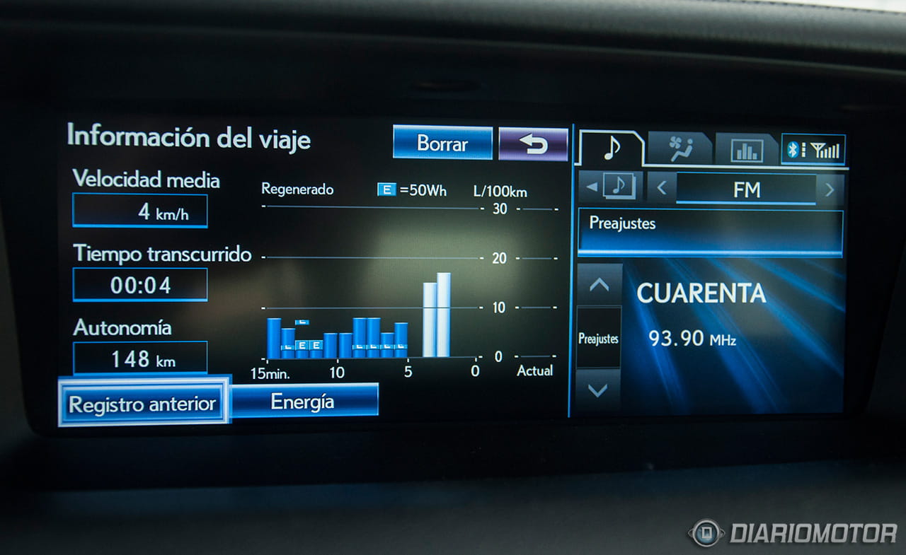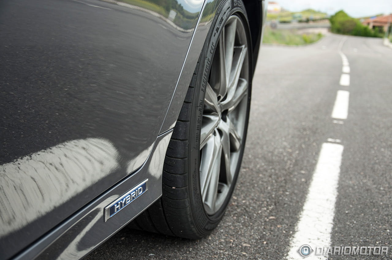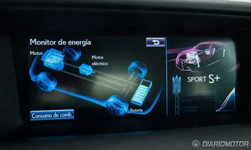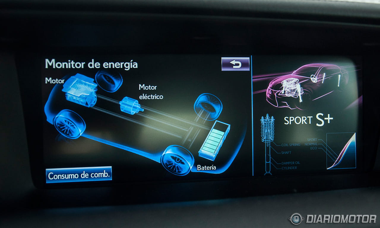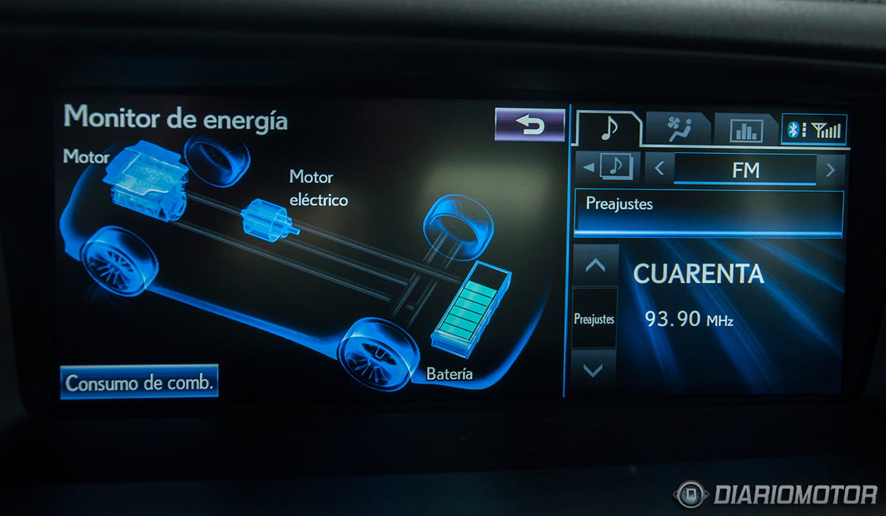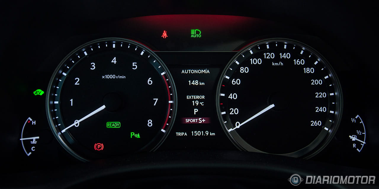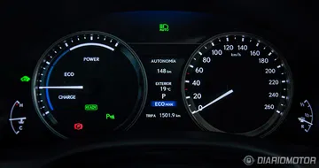 El cuadro de mandos, aunque a priori parece conservar la clásica disposición de cuentarrevoluciones y cuentakilómetros analógico con una consola de a bordo central, es completamente dinámico y se adapta al modo de conducción. De esta forma cuando circulemos en modo Eco, además de estar retroiluminado con luz azul, lo que veremos en lugar del cuentarrevoluciones será una aguja con varios indicadores en los que se nos especifica si estamos en el rango Charge, es decir, el motor eléctrico funciona como inversor para recargar la batería; en rango Eco, con un consumo de gasolina muy reducido; o en rango Power, llevando a sendos motores al máximo de sus posibilidades para extraer unas mejores prestaciones.