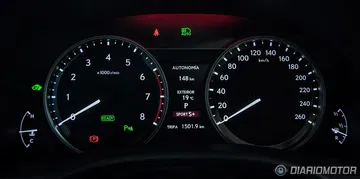 Con un giro del selector de modos pasamos a Sport o Sport+ y el cuadro de mandos se ilumina con un evocador tono rojizo apareciendo un cuentarrevoluciones al uso con la franja roja sobre las 6.000 rpm.