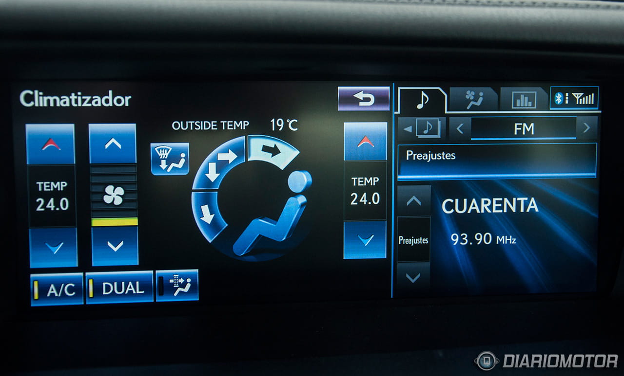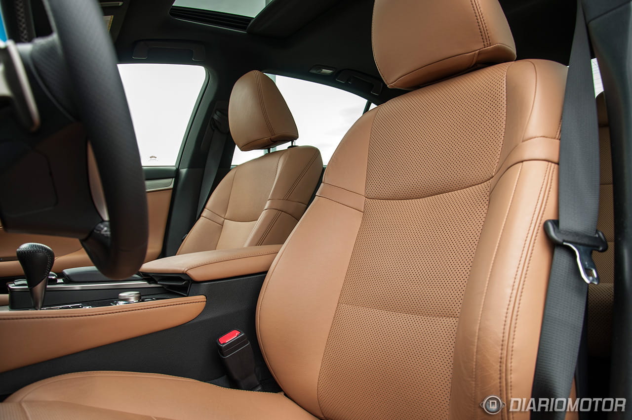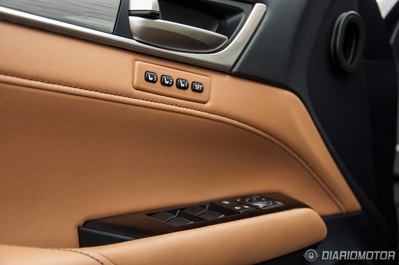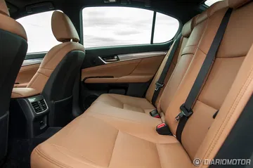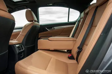 En una berlina deportiva personalmente preferiría un buen tapizado mixto de piel y Alcantara, pero sin coste añadido este F Sport únicamente está disponible con tapizado de piel y cuatro temas de color diferente (cuero negro, cuero garnet grana, cuero camel y cuero marfil). La morfología de los asientos delanteros es más propia del confort de la autopista que de un deportivo al uso, lo cual no reviste mayor problema si contamos con dieciséis ajustes eléctricos, incluidos lumbares, y memoria. La flexibilidad de los ajustes nos permite adaptar la base y el respaldo a nuestro cuerpo y ofrecer una sujeción muy aceptable si tuviéramos que lidiar con muchas fuerzas G laterales. Por cierto, la columna de la dirección también cuenta con ajustes eléctricos en altura y profundidad y memoria y automáticamente se pliega y se recoloca cuando apagamos o accionamos el contacto del coche.