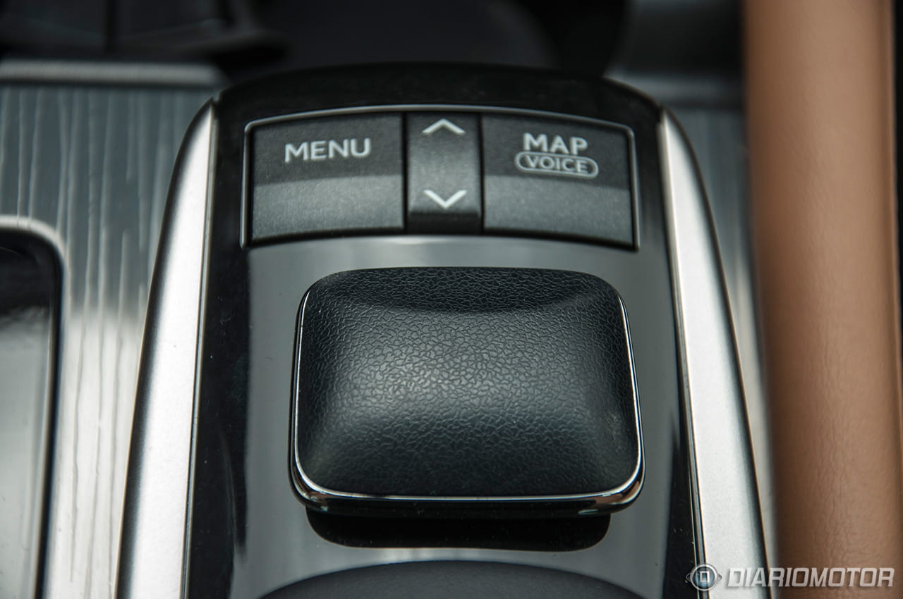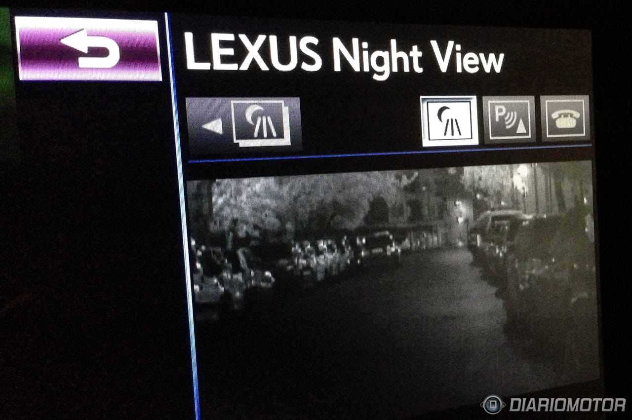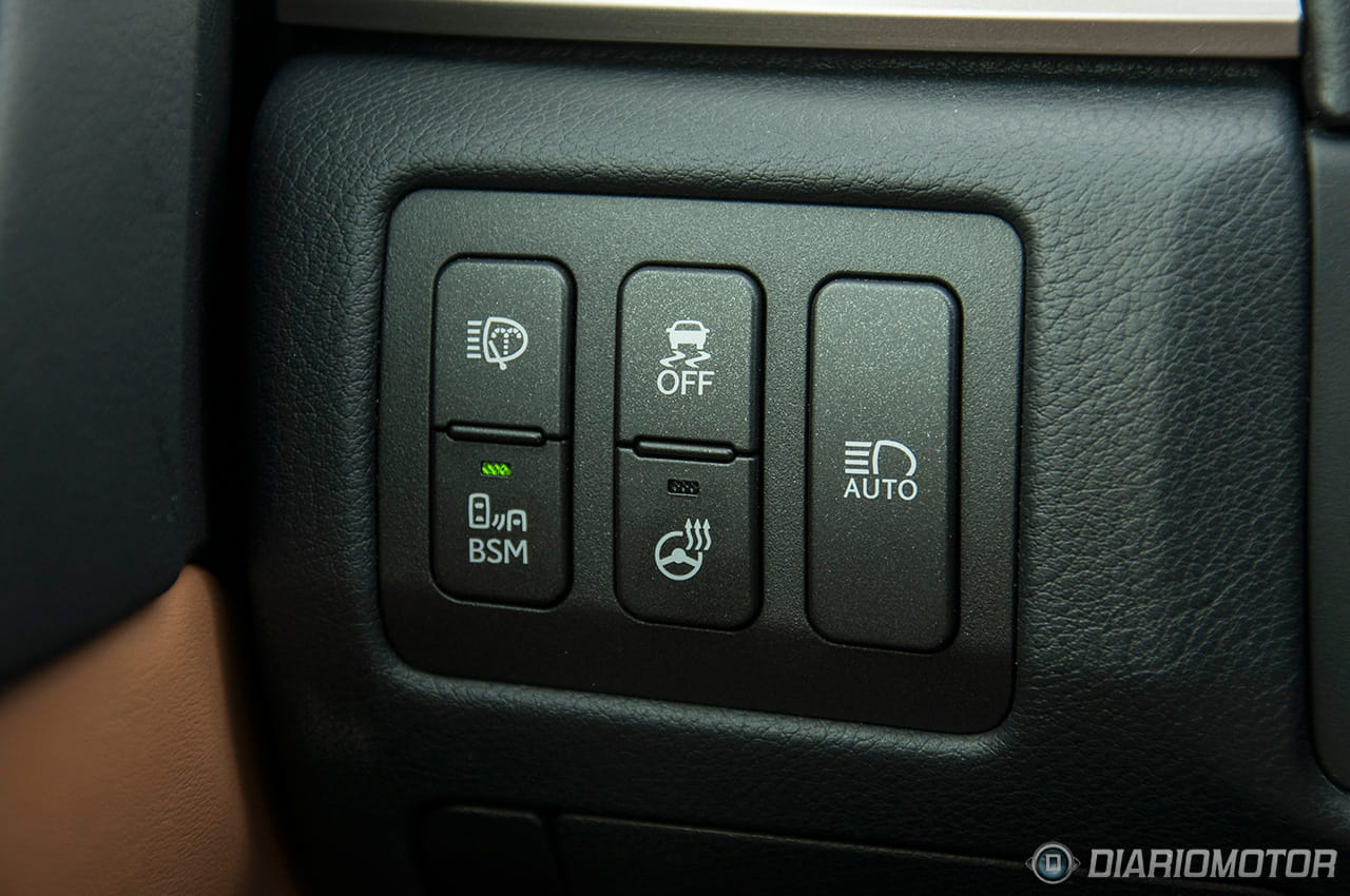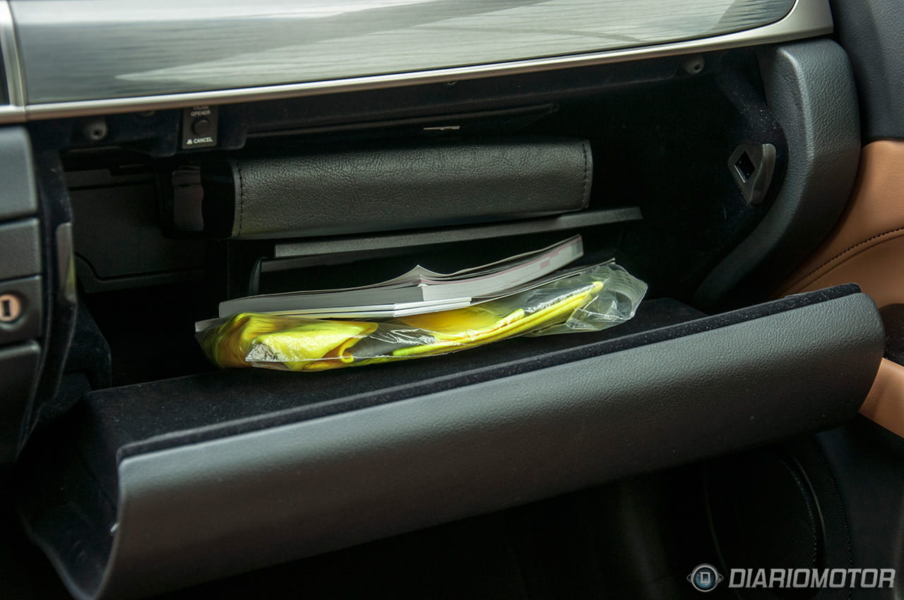Por encima del cuadro de mandos, el Head-Up Display proyecta directamente en el parabrisas nuestra velocidad o las indicaciones de la ruta del navegador. En estos tiempos en que la persecución de los excesos de velocidad se ha elevado, resulta de especial utilidad para controlar el ritmo sin desviar la mirada de la carretera, aunque también contamos con un control de crucero adaptativo con sistema de pre-colisión (nos avisa si detecta un obstáculo para evitar el choque y si el conductor no responde activa el freno). Para evitar choques también contamos con un sistema de visión nocturna que muestra las imágenes de la cámara frontal en la pantalla del equipo multimedia resaltando peatones y otros obstáculos.