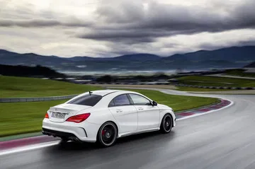 De serie cuenta con unas llantas de aleación ligera AMG de 18 pulgadas, con neumáticos con unas dimensiones de 235/40. Tras ellas, el sistema de frenos de alto rendimiento de AMG, con discos de freno perforados y ventilados con unas medidas de 350×32 milímetros en el eje delantero y de 330×22 milímetros en el eje trasero. Además, su dirección, también es específica de esta versión.