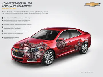 En Estados Unidos la gama de motores del Chevrolet Malibu 2014 se compondrá de dos opciones. El primero, un Ecotec 2.5 DOHC de cuatro cilindros e inyección directa que se erige como la opción básica con 196 CV y 253 Nm de par máximo. Gracias a su sistema de parada y arranque automático o a una optimización de las válvulas en admisión para adaptarse a la carga del motor, este bloque es más ahorrador y a la vez potente que el 2.4 previo, que en Europa se comercializa con una potencia de 167 CV.