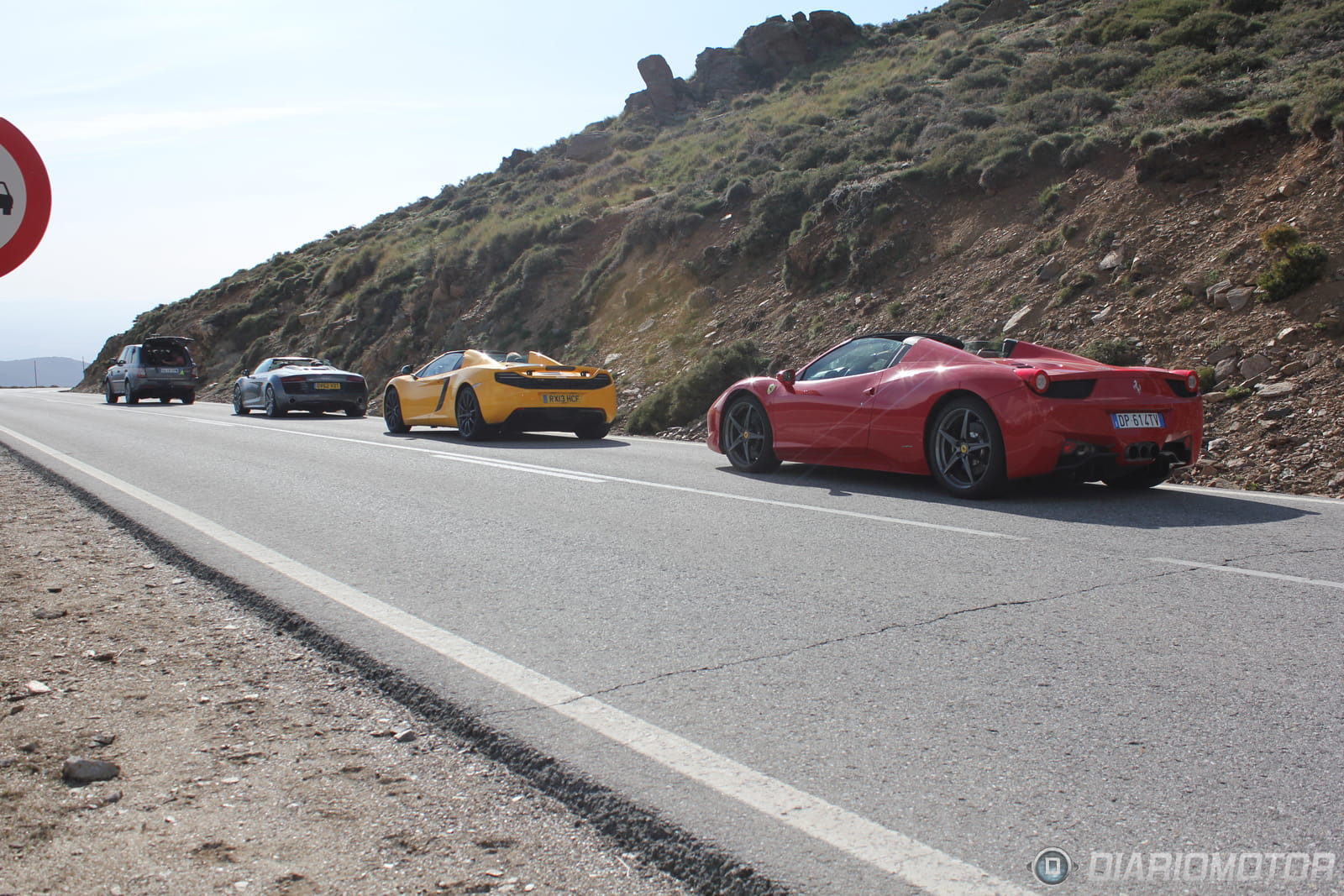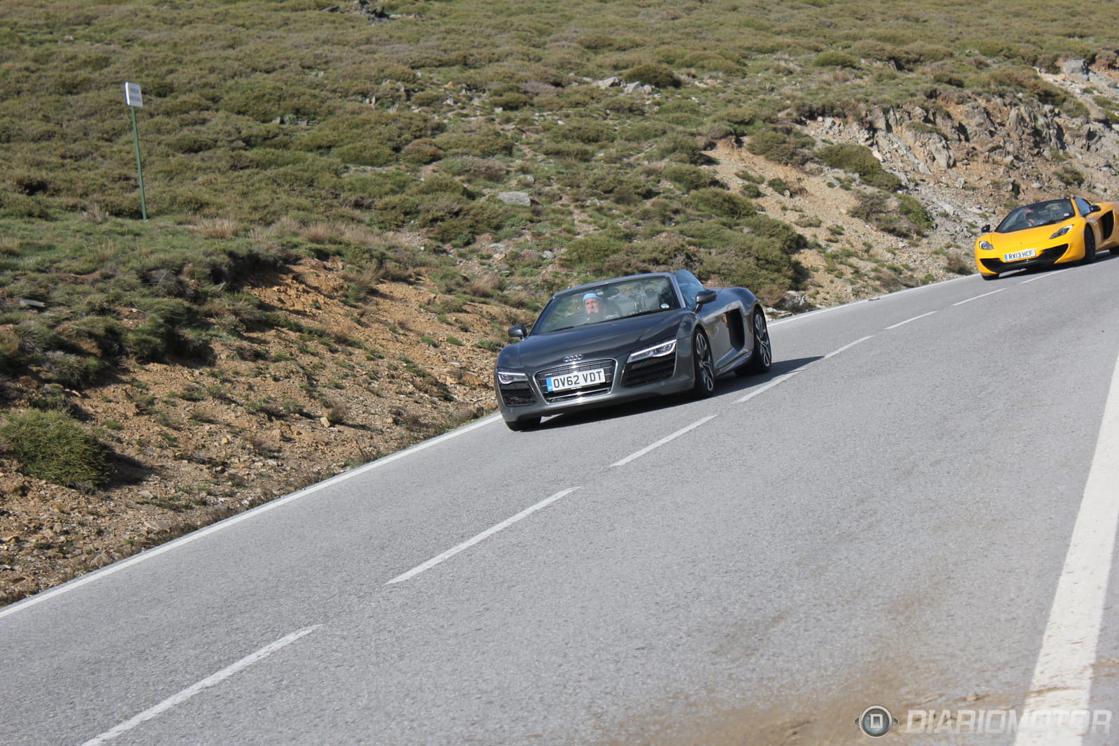 El despliegue en torno al equipo de Top Gear era máximo. Al menos cuatro o cinco coches acompañaban a los tres superdeportivos, más dos coches-cámara y un par de furgonetas. No es de extrañar que el convoy no pasase desapercibido, especialmente cuando las carreteras de Sierra Nevada suelen estar desiertas en estas fechas, una vez que la estación de esquí ha echado el cierre.
