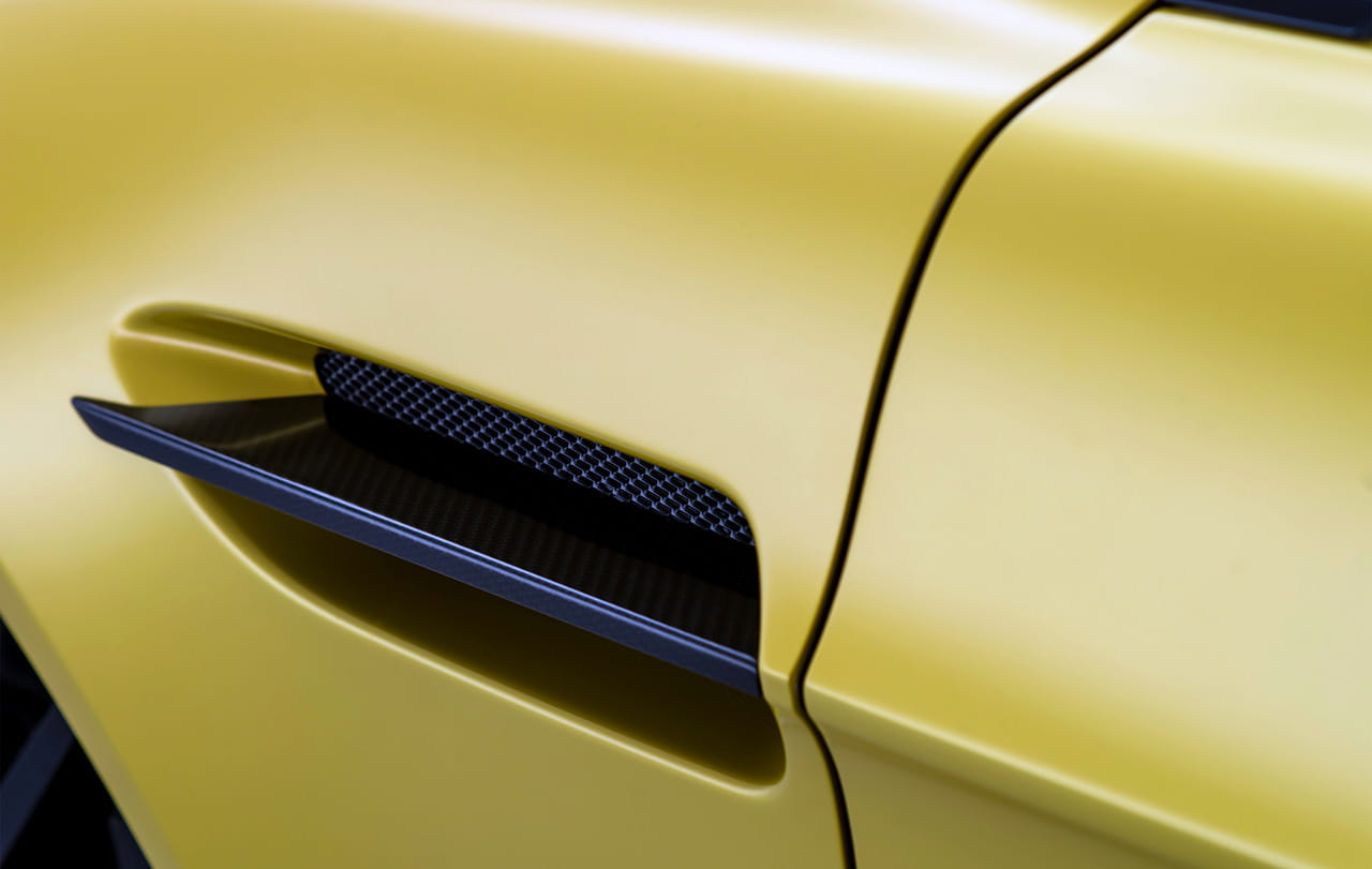 En el DB9 el cromado de las branquias laterales se prolonga hacia la puerta, detalle por el cual ya podríamos diferenciarlo de un Vantage. Este detalle también es común con el Vanquish y el antiguo DBS, aunque en este caso la confusión es menos lógica por el aspecto mucho más deportivo y aerodinámica cuidada de ambos por su condición de buque insignia de la marca.