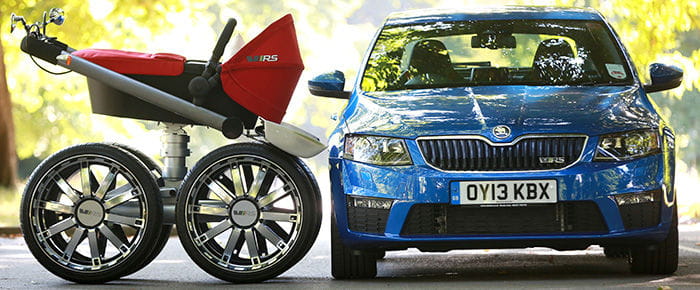 Nota: La fotografía que ilustra este artículo muestra la divertida locura que idearon la gente Skoda para la presentación de su nueva berlina deportiva, el Octavia RS. Un flamante carrito para bebés con llantas de 20”. Hemos subido la galería para deleitaros con la ocurrencia de Skoda.
