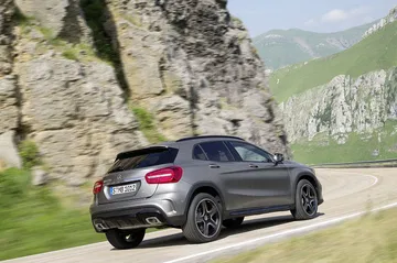 El Mercedes GLA bebe directamente del lenguaje anticipado por el Mercedes CLA, por el Mercedes Clase A, pero debidamente adaptado al segmento SUV. Siguen presentes los nervios laterales como señal característica, ópticas de diseño parejo tanto para el frontal como la zaga o un aspecto para el paragolpes delantero similar, pero se añaden protecciones inferiores para ambos lados, integrándose las salidas de escape en el difusor posterior y se añaden taloneras en un acabado contrastado.