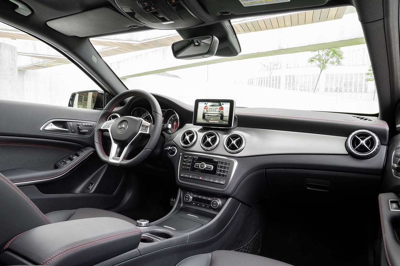 Si la línea exterior del Mercedes GLA bebe directamente del lenguaje del Mercedes Clase A, del Mercedes CLA, en su interior nos encontramos con la misma apuesta, encontrándonos con la misma disposición que en sus hermanos compactos y los mismos elementos, presentándose eso sí bajo un nuevo aspecto, al menos para su presentación, en el que se ha conjugado la madera con tonos marrones para la tapicería, salpicadero y guarnecidos.