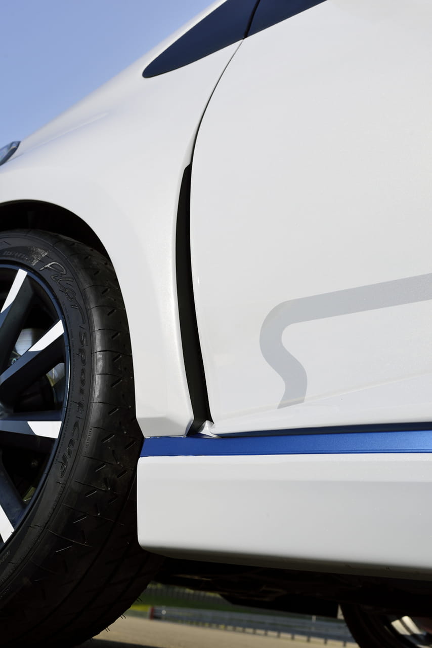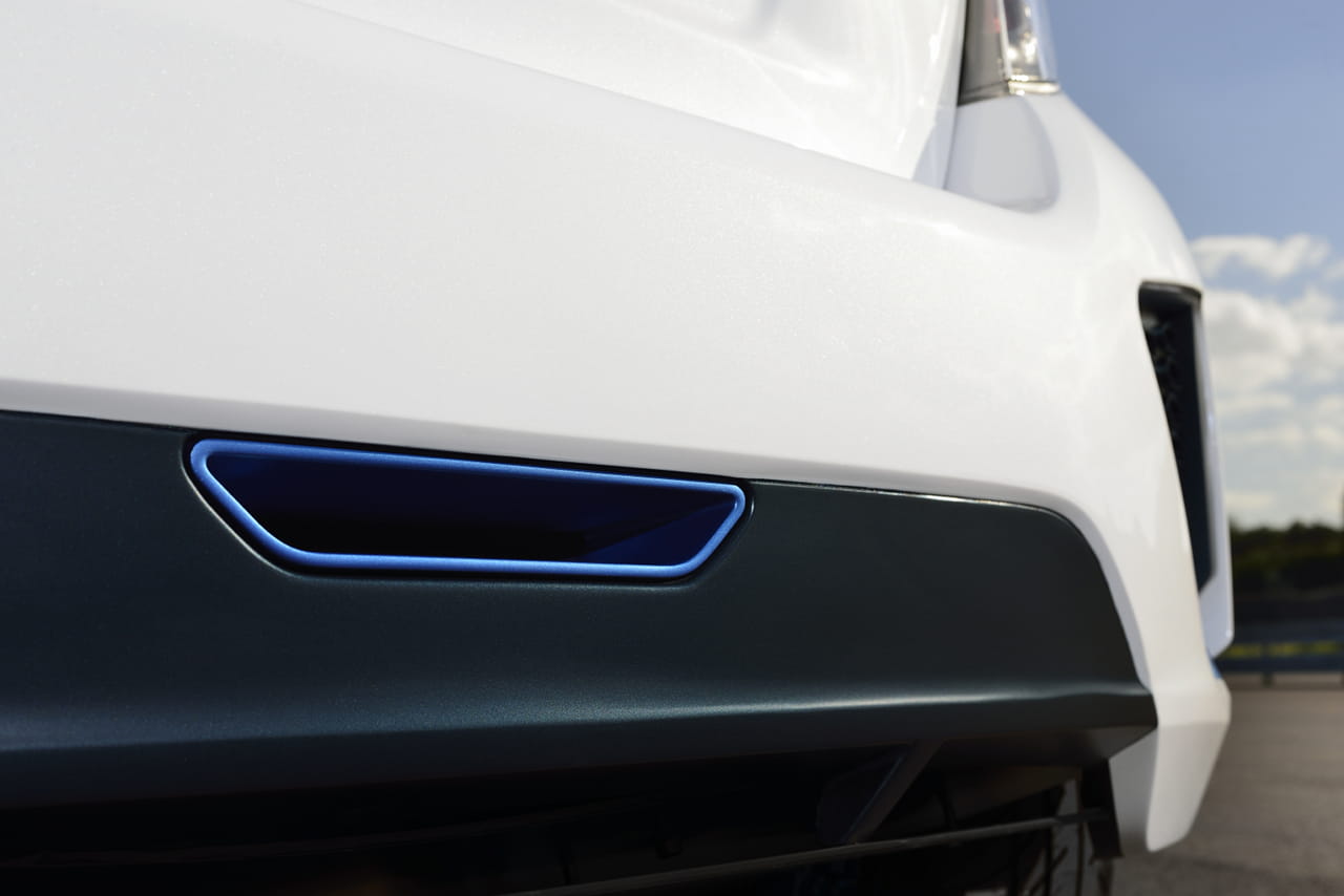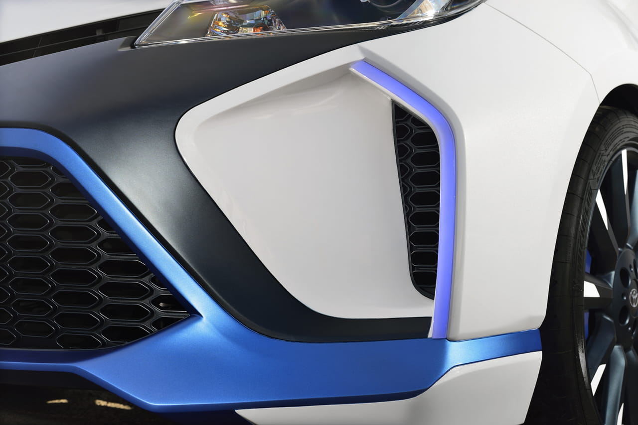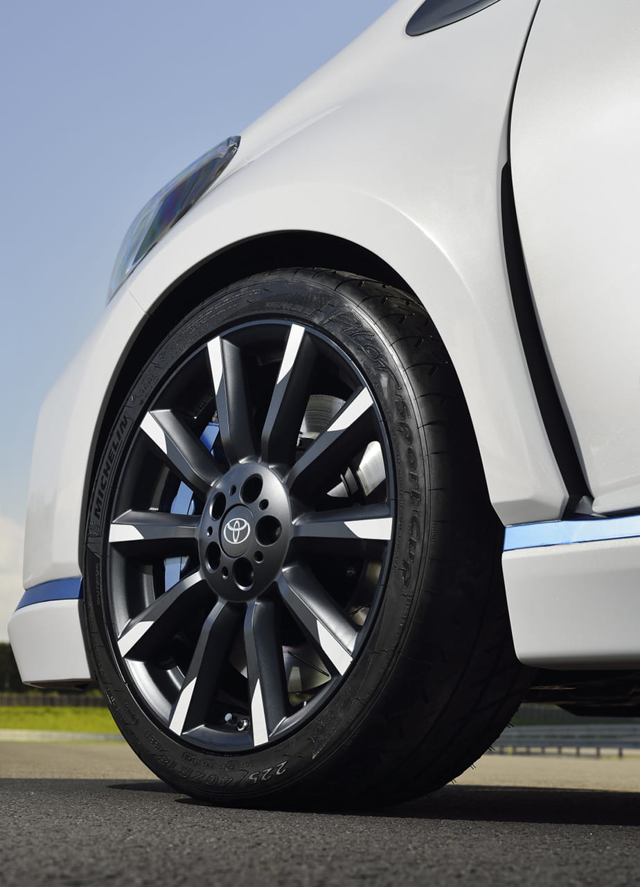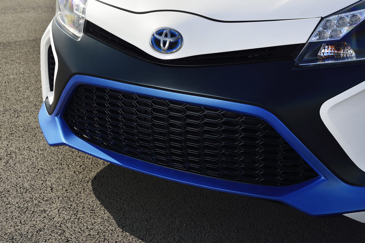 Para recibir el conjunto híbrido de 420 caballos, el pequeño japonés se ha engalanado con un kit de carrocería que seguro a más de un propietario del utilitario le gustaría tener. Un paragolpes con una parrilla frontal de grandes dimensiones, aletines laterales, las taloneras de su perfil, un paragolpes trasero más discreto pero igualmente deportivo, llantas firmadas por TRD de 18 pulgadas con neumáticos Michelin Pilot Sport Cup y pinceladas en azul para aderezar el conjunto.