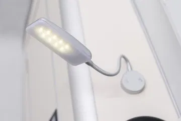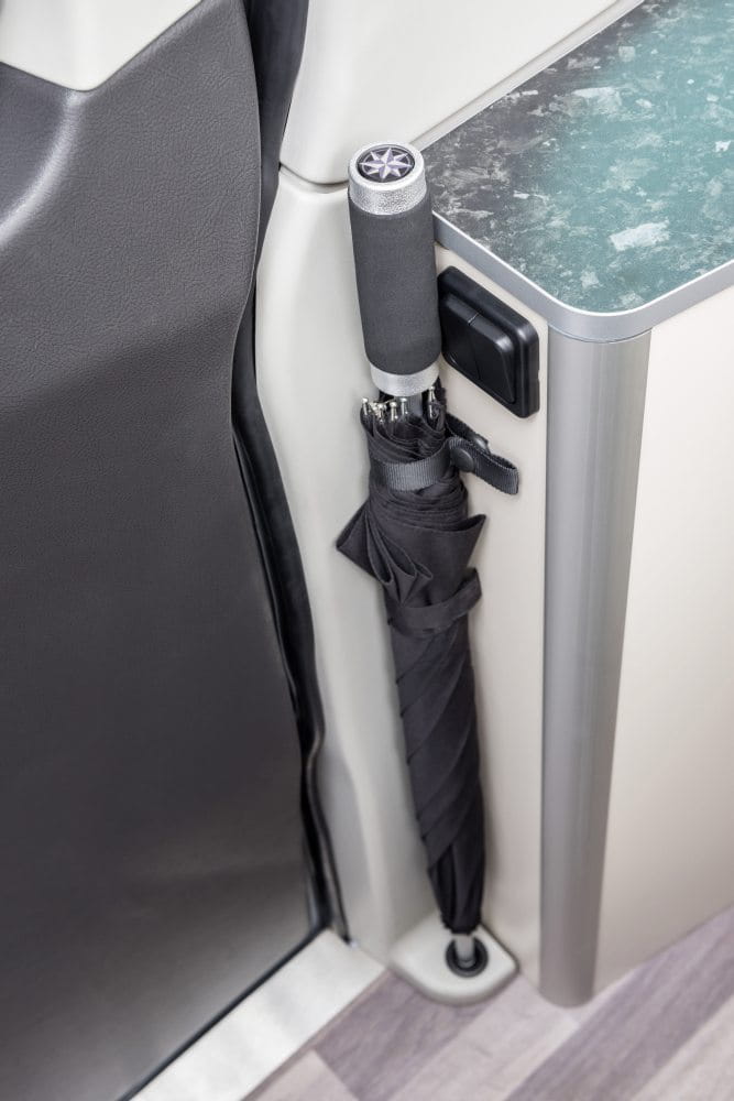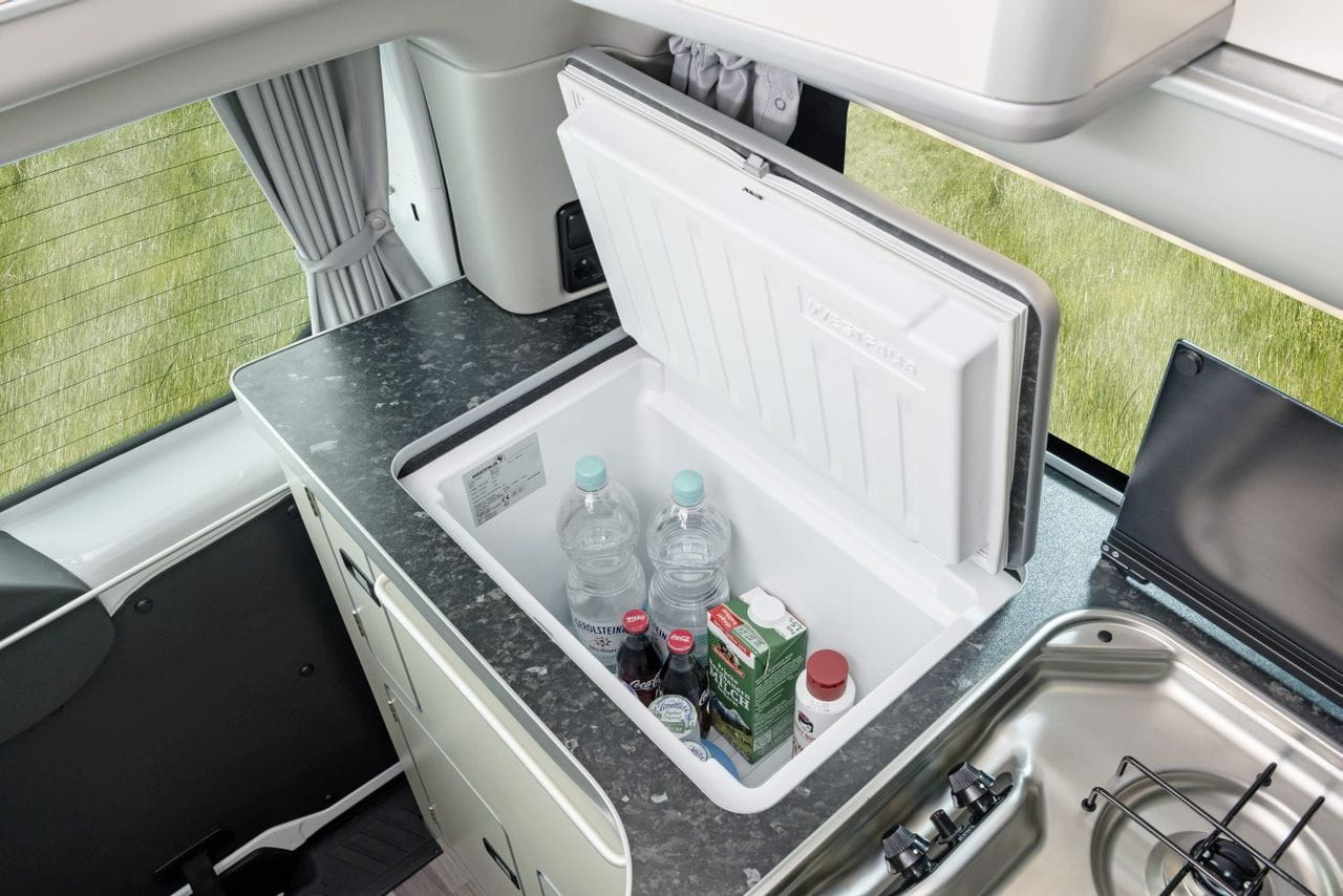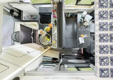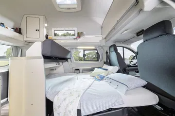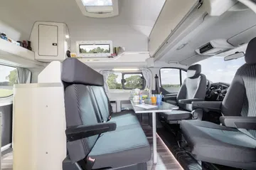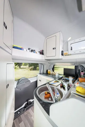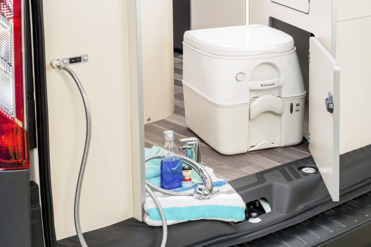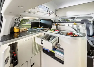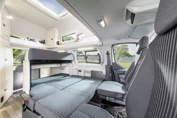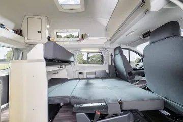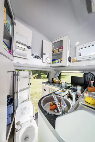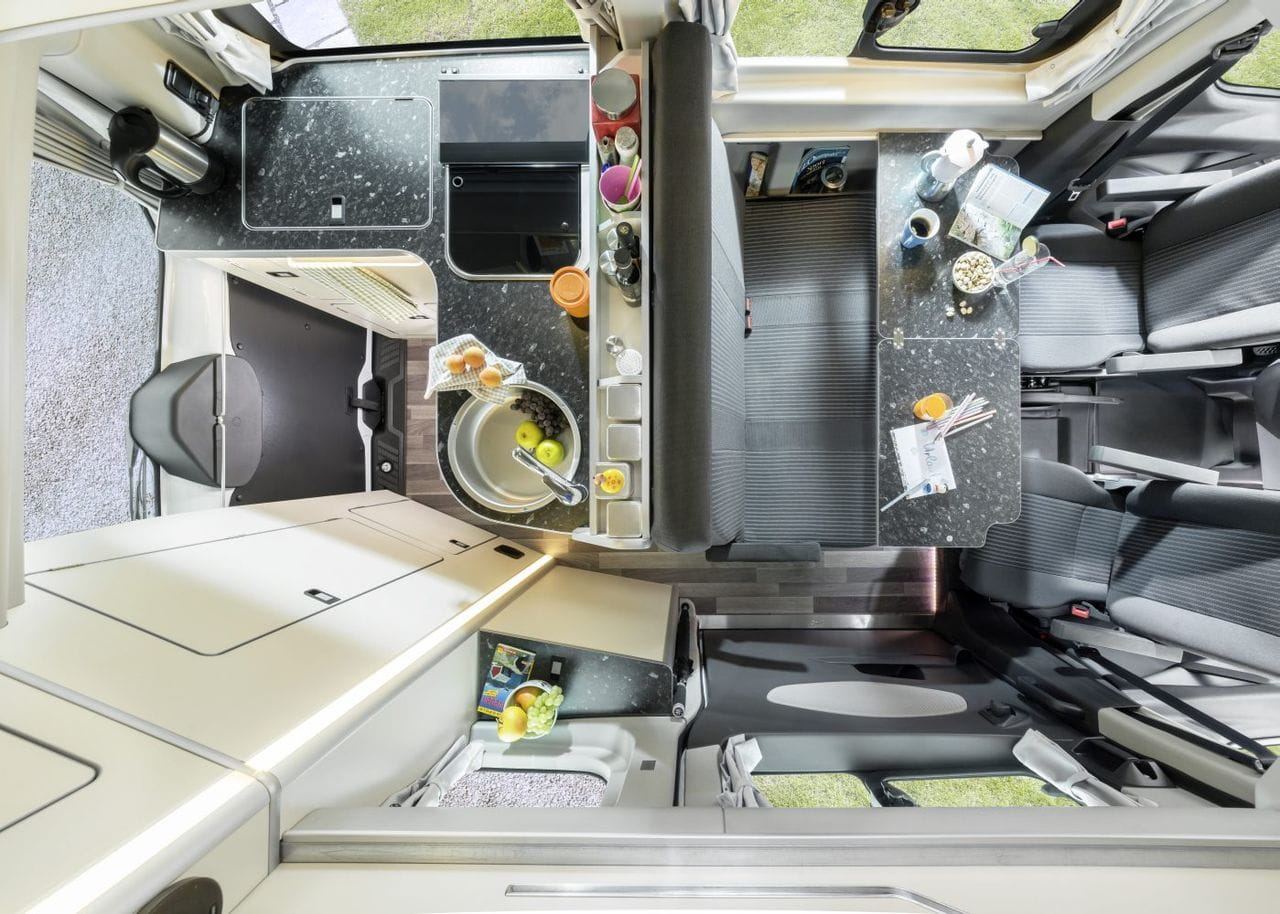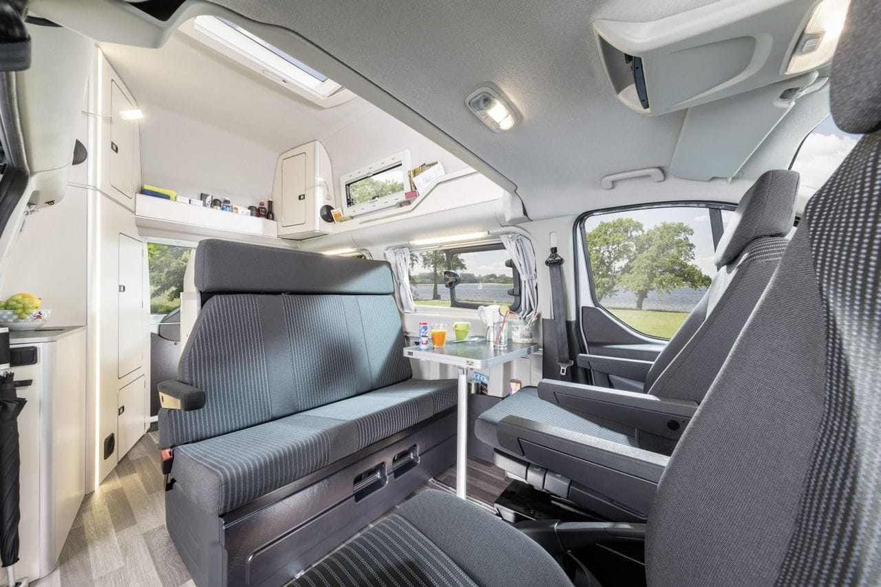 El área de cocina también cuenta con un fregadero y un aseo, con su correspondiente inodoro y una ducha. Eso sí, hay que ducharse fuera de la furgoneta, así que habrá que esconderse de las miradas indiscretas. Varios armarios y baldas permiten guardar todos los alimentos de forma adecuada. Una pequeña mesa cumple la función de mesa de comedor, a la que se pueden sentar los ocupantes de la segunda fila y piloto/copiloto, cuyos asientos son pivotantes. Los asientos de la segunda fila se abaten completamente para formar una cama de 1,9 metros x 1,3 metros.