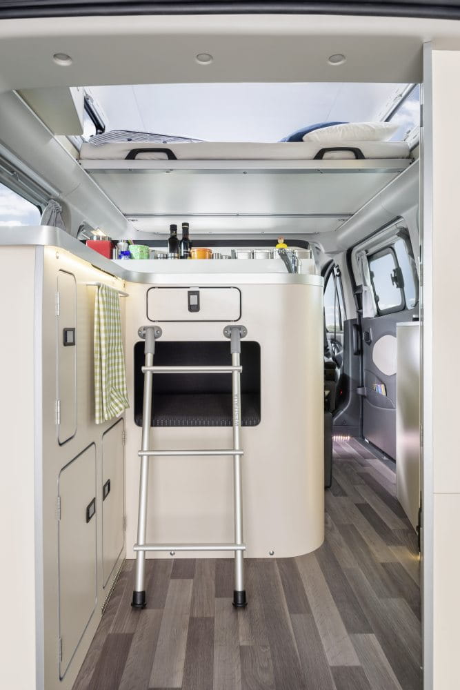 Para ello se ha diseñado un espacio con dos “habitaciones”, a las que se accede bien por la puerta corrediza lateral o bien por la puerta trasera convencional. En primer lugar disponemos de un área destinada a la cocina y el aseo, mientras que el área destinada a dormir se encuentra bajo el techo de la furgoneta, en el tradicional segundo piso. El área funcional es la cocina, donde cabe una cocina de gas de dos fogones, además de un frigorífico de 40 litros de capacidad. El depósito de agua de la Nugget tiene 42 litros de capacidad.