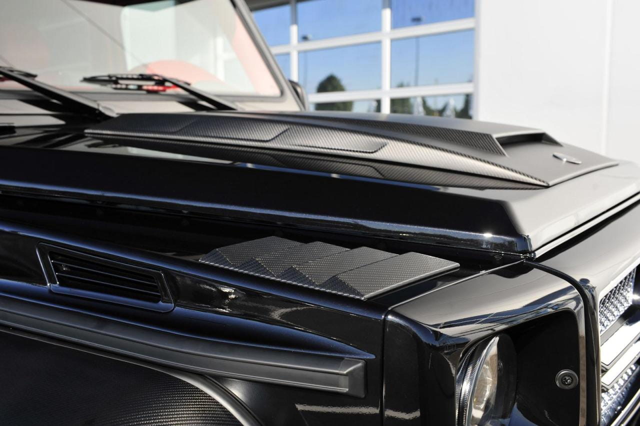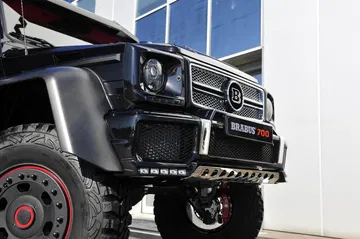 Frente al ya poco discreto Mercedes G 63 AMG 6X6, el Brabus B63S ofrece en su exterior nuevos detalles en su paragolpes frontal, con una protección para los bajos y la presencia de los faros de xenón, mientras que en su capó aparecen unas nuevas tomas en fibra de carbono o su parrilla, coronada ahora por el logo de Brabus.