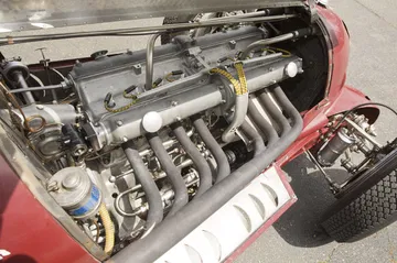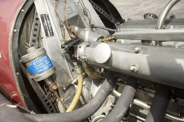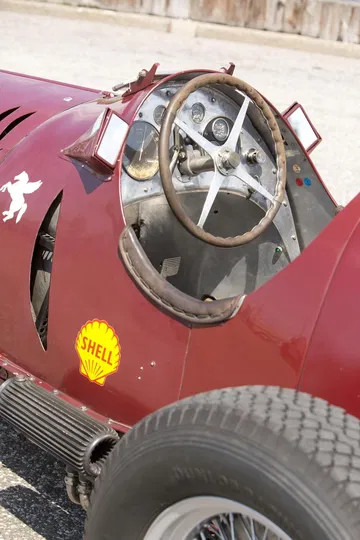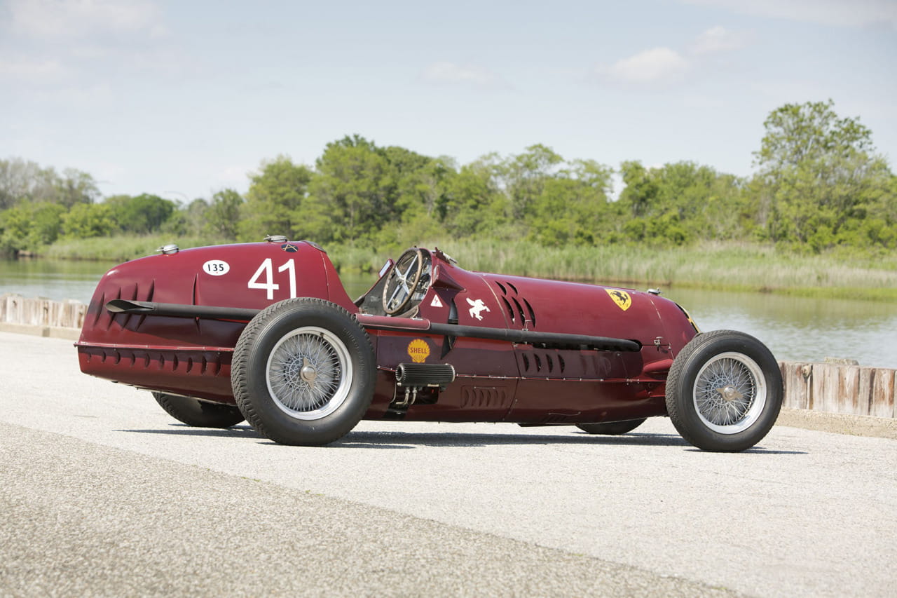 La parte trasera termina de forma aerodinámica, con abundantes ranuras de ventilación y el característico cierre del depósito de combustible. Este agresivo monoplaza se ha subastado sin apenas restaurar, y con los colores originales de la Scuderia Ferrari. El alma de esta máquina era un motor de ocho cilindros en línea, con doble árbol de levas en cabeza y sobrealimentado por un compresor volumétrico.