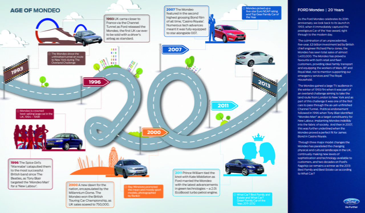 Ford ha preparado un vídeo a propósito, para recordarnos como era el mundo hace 20 años. Los dinosaurios volvían a hacer de las suyas con el estreno de Jurassic Park y Jeremy Clarkson profesaba su devoción por el nuevo Mondeo, apostillando que Ford había logrado el mejor producto de su clase. Por aquel entonces, el Mondeo presumía de su airbag de conductor y de ofrecer opcionalmente control de tracción, frenos ABS y dirección asistida. En definitiva, una historia más para recordarnos lo viejos que somos.