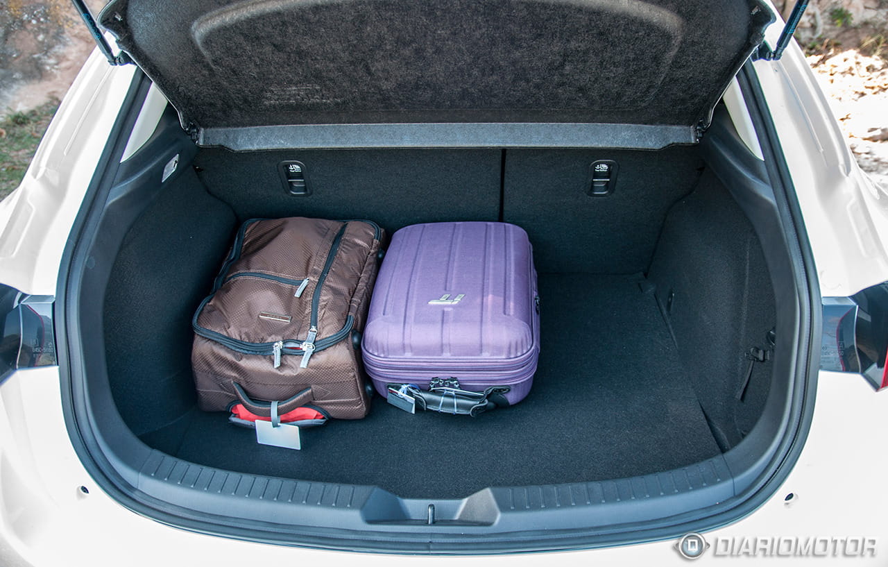 El Mazda 3 ha crecido en longitud y anchura y eso se aprecia en el espacio del habitáculo. Aún así, las plazas traseras siguen sin ser extraordinariamente espaciosas ni en anchura ni en espacio para las piernas, tampoco en altura. El maletero goza con un volumen de 350 litros y cuenta con un doble fondo muy estrecho en el que nos encontramos con un kit de reparación de pinchazos. En España se ofrecerá rueda de repuesto temporal como opción (aún no sabemos su precio), pero ya podemos adelantar que reducirá aún más el volumen de carga puesto que en el doble fondo en el que se equipa el kit de reparación no cabe una rueda de tipo “galleta”.