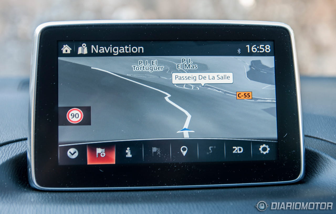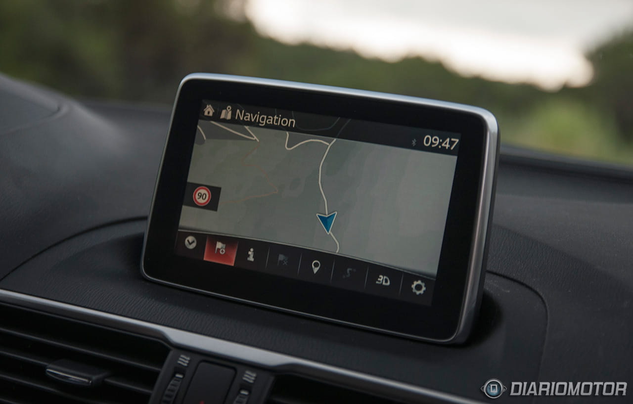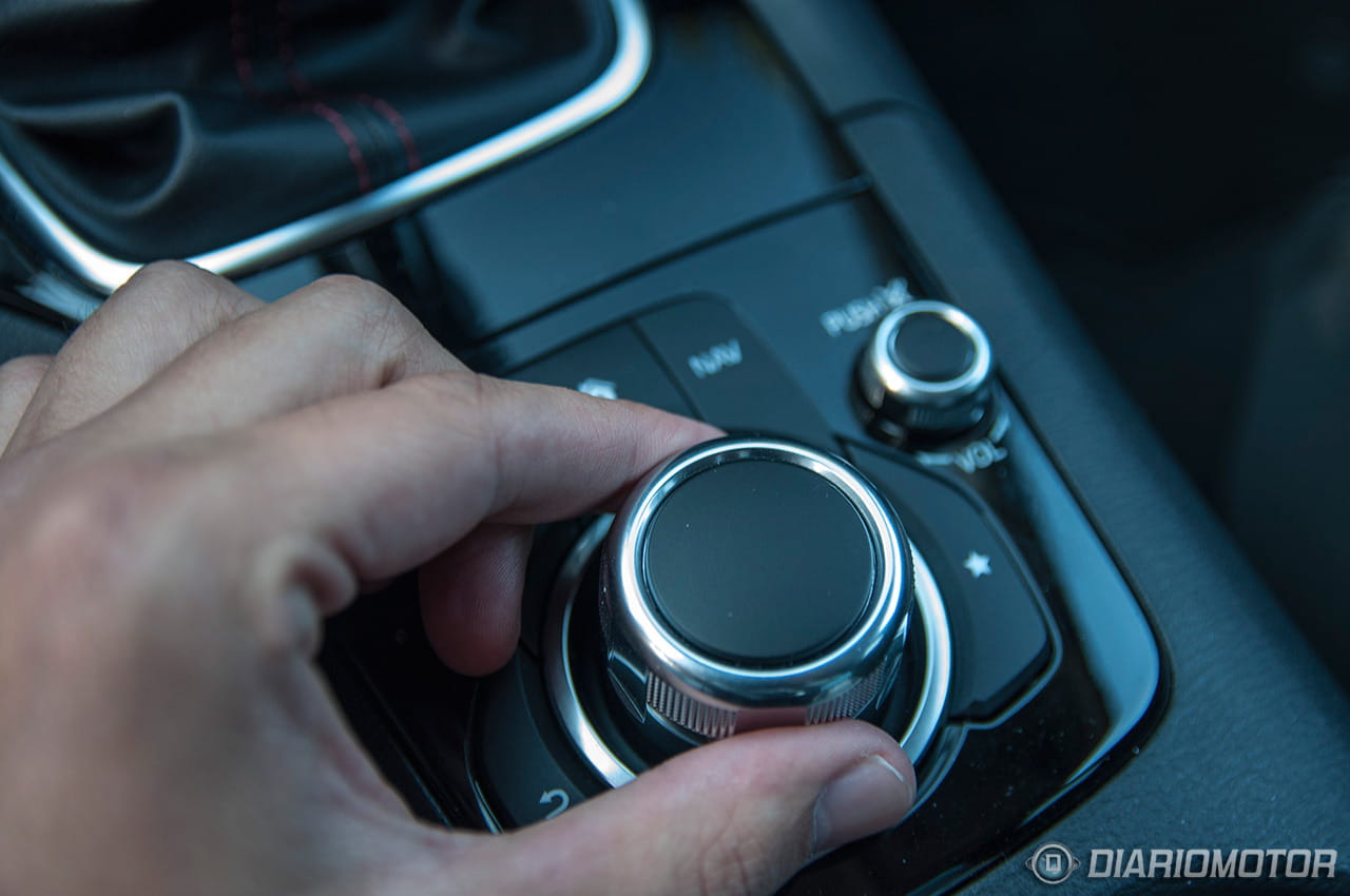 Sin dejar que el espectáculo visual que apreciamos en el exterior condicione el resto de nuestra prueba, nos subimos a bordo para sorprendernos con un habitáculo realmente conservador. Mazda ha optado, como de costumbre, por un salpicadero horizontal, aunque orientado a su conductor. Todos los elementos encajan a la perfección y no hay más añadidos artificiales que la pantalla de 7” del equipo multimedia MZD Connect sobre el salpicadero. Aún así su posición me parece excelente para facilitar su visión y tan solo echamos en falta que cuente con un dispositivo escamoteable para esconderla cuando aparquemos y disuadir a los amigos de lo ajeno. Lo mejor es que leáis nuestro análisis en Tecmovia sobre el sistema MZD Connect de Mazda.