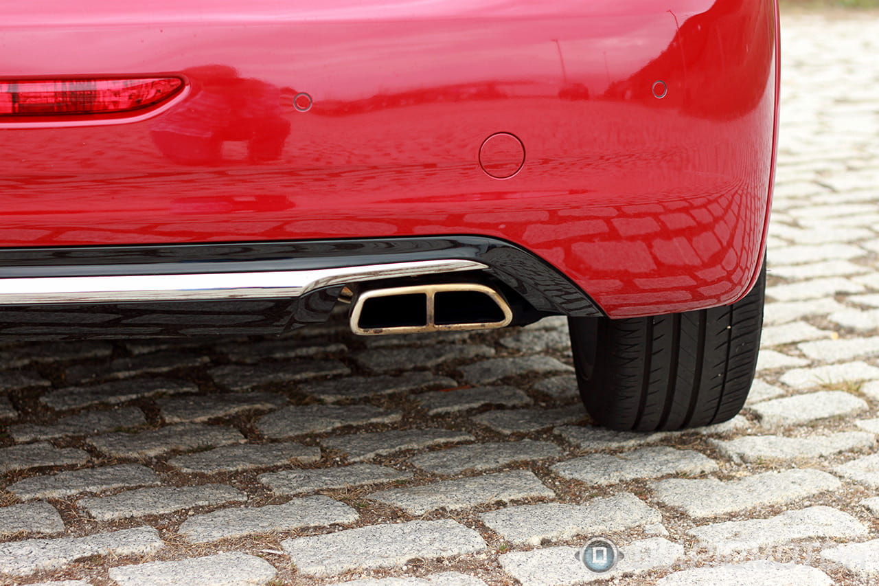 Visto desde el lateral, no existen líneas de adorno, sólo formas naturales del coche y chapa con formas sencillas. La línea de las ventanillas es horizontal, acompañando la moldura lateral partida en dos por una línea roja. Esa línea roja que recorre defensas y molduras rodea todo el coche y parece separar el tren de rodaje del resto de la carrocería.