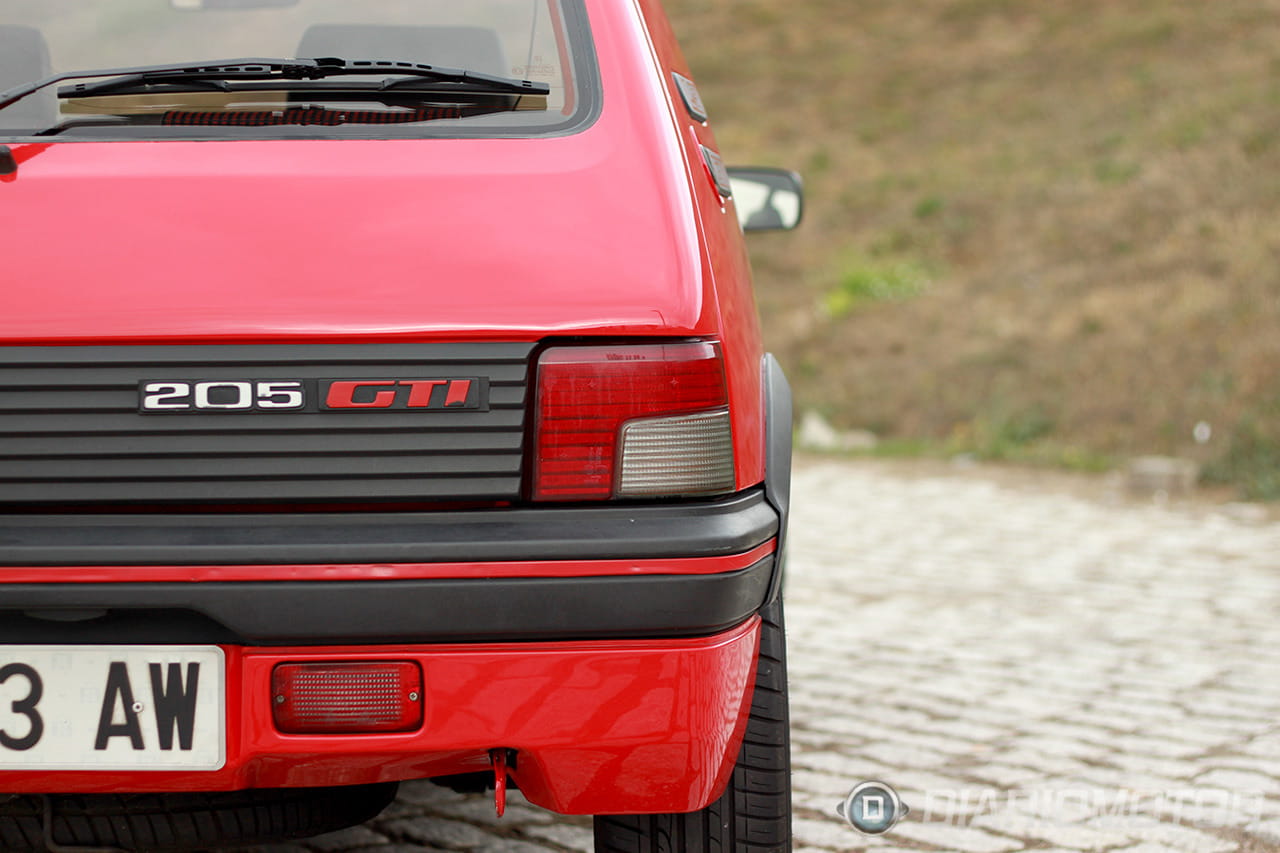 Lo primero que llama la atención son sus proporciones. El 205 tiene el perfil de un coche de juguete, hasta el punto que casi dan ganas de agarrarlo por el techo con dos dedos y ponerse a jugar con él. Existe una relación mágica en su perfil, en las ruedas ligeramente grandes, en los pasos de rueda ampliados por molduras negras que los hacen visualmente más amplios. El montante trasero, sin ventanilla y con el anagrama 1.9 GTI, parece apoyarse directamente en la rueda. Se ve liviano y ágil, tal cual es.