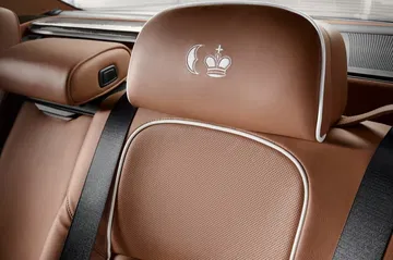 En la moldura de la tapa del maletero va inscrita la frase identificativa ROBBE & BERKING STERLING y en el pilar C va plasmado el nombre ROBBE & BERKING. La pintura Singapore Grey contribuye aún más a ese toque exclusivo y de lujo discreto que emana el modelo. En el interior también nos encontramos numerosas partes acabadas en plata martillada, como los listones que adornan el salpicadero y los paneles de las puertas o incluso la banda que recorre el reposabrazos central trasero. La tapicería de cuero es de color marrón Amaro, extraída del catálogo Individual, y lleva bordado el logotipo de la media luna (el símbolo internacional de la plata) y una corona que representa al Estado alemán.