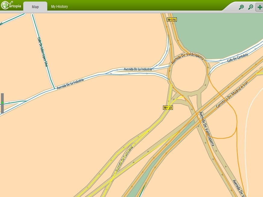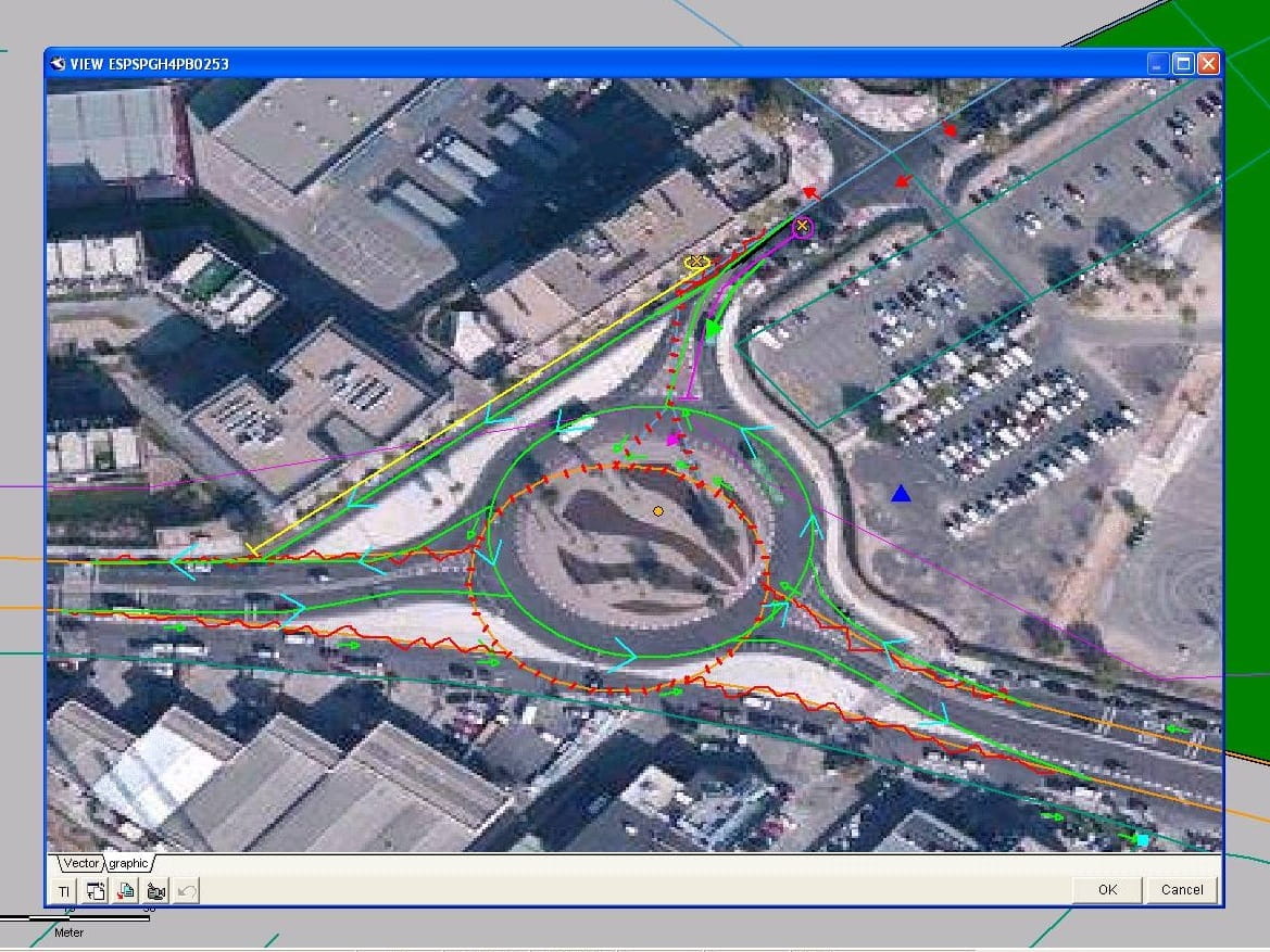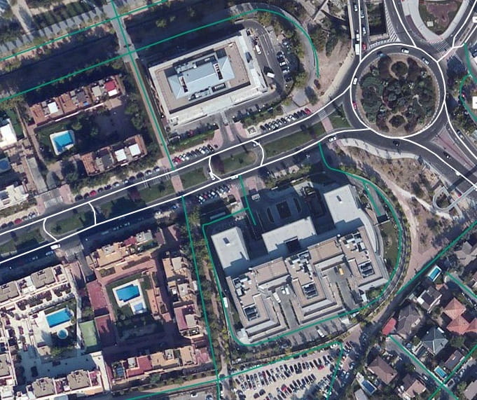 Aquí se nos muestran las diferentes capas que determinan el trazado actual, el trazado provisional por obras y el trazado definitivo de una rotonda muy concurrida en Madrid que en los últimos meses ha estado en obras.