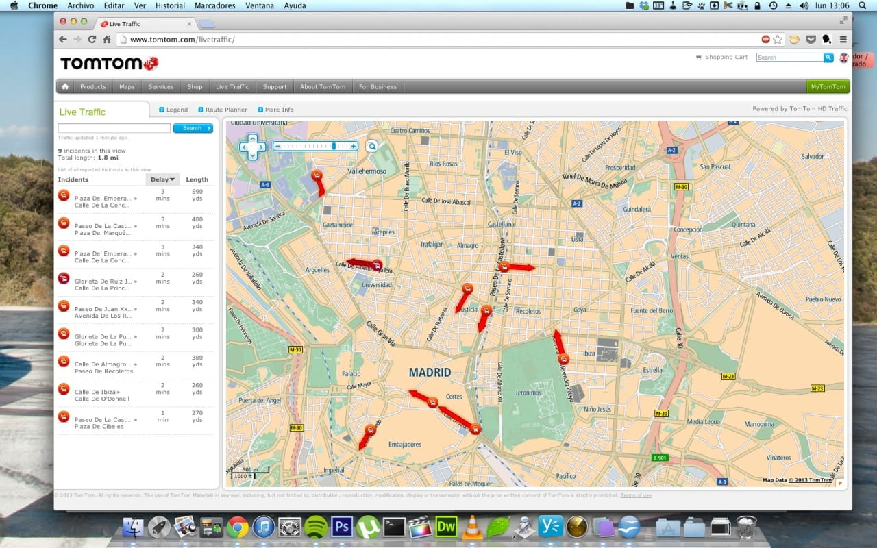 [13:05] La zona centro de Madrid aparece con numerosas retenciones en algunos tramos de calles importantes. El nivel de detalle es sorprendente, a nivel de tramo entre manzanas y perpendiculares.