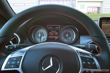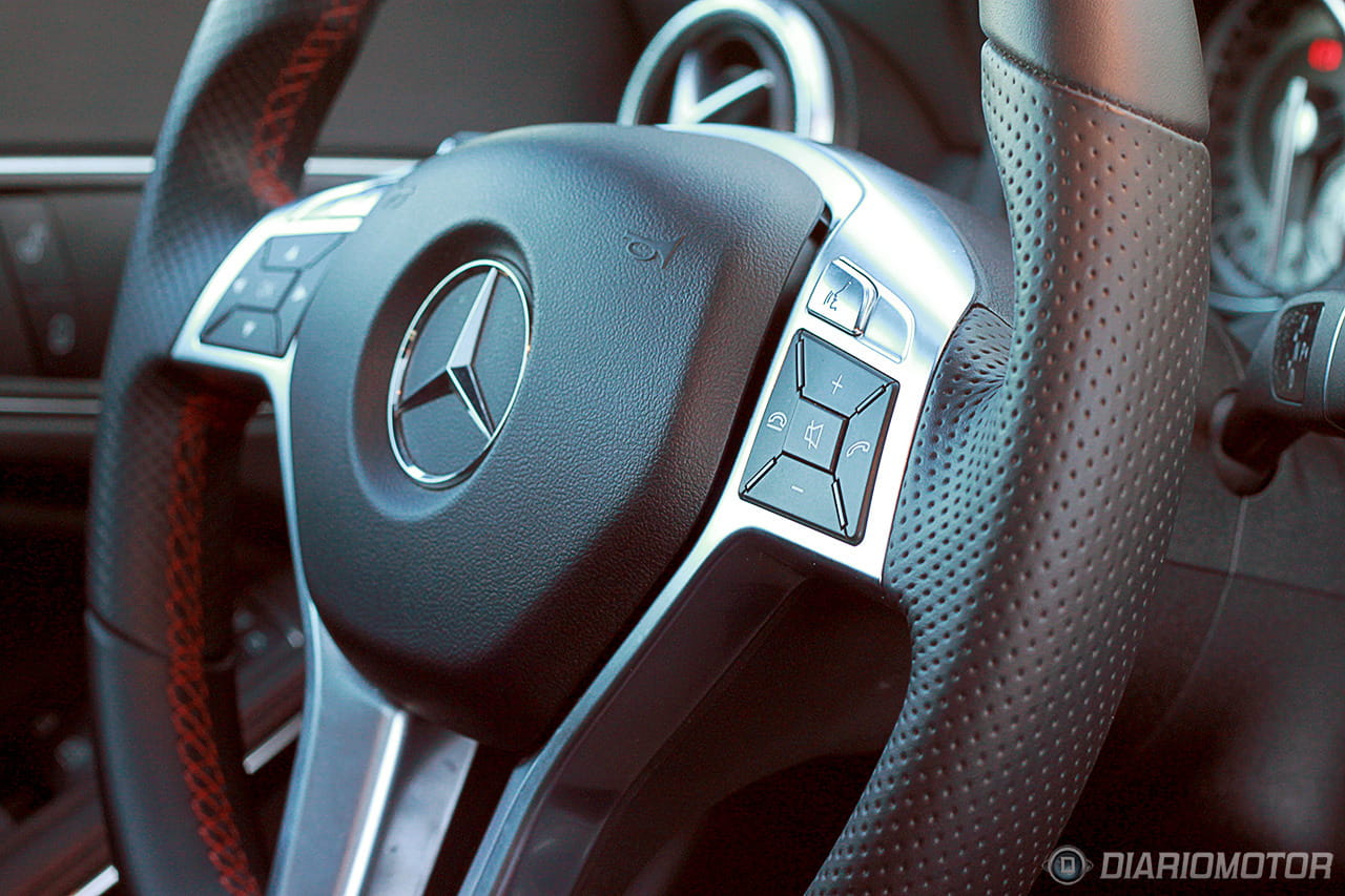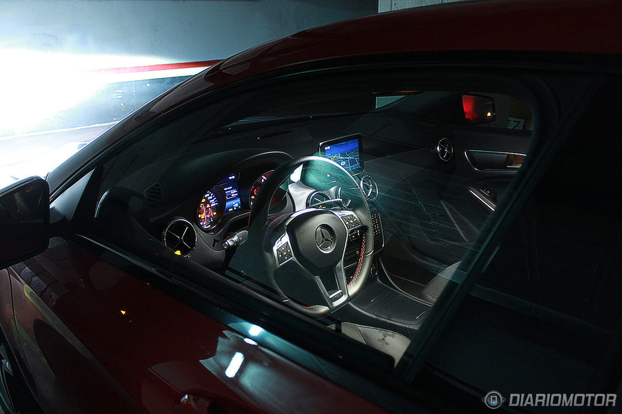 Abrimos ya la puerta (sin marco en ninguna de las 4 ventanillas) y nos recibe un interior prometedor. El anagrama de Mercedes en el marco inferior de la puerta se ilumina, y la luz interior es muy blanca y bastante intensa, con lo que podemos apreciar incluso de noche un puesto de conducción atractivo y deportivo. Me gusta.