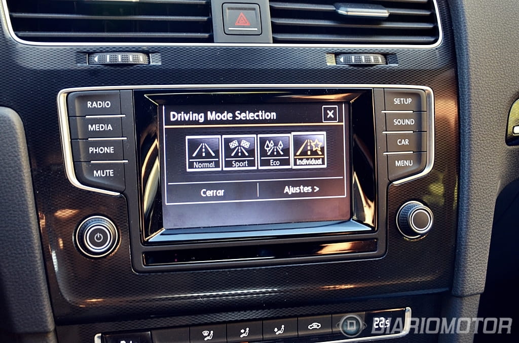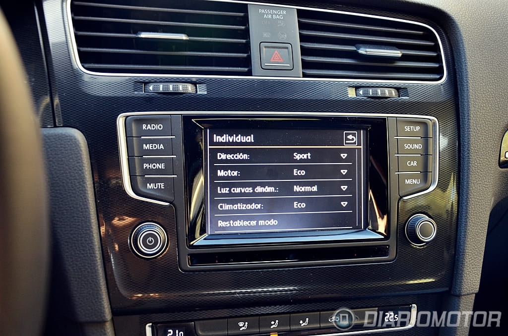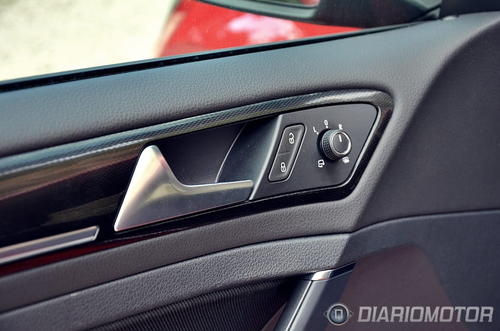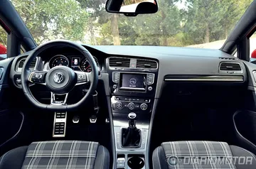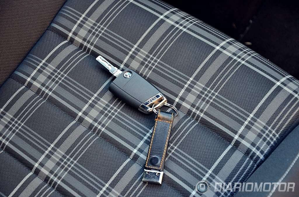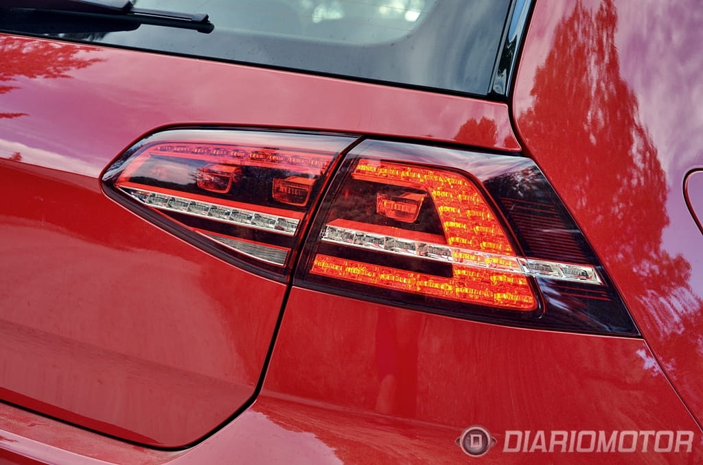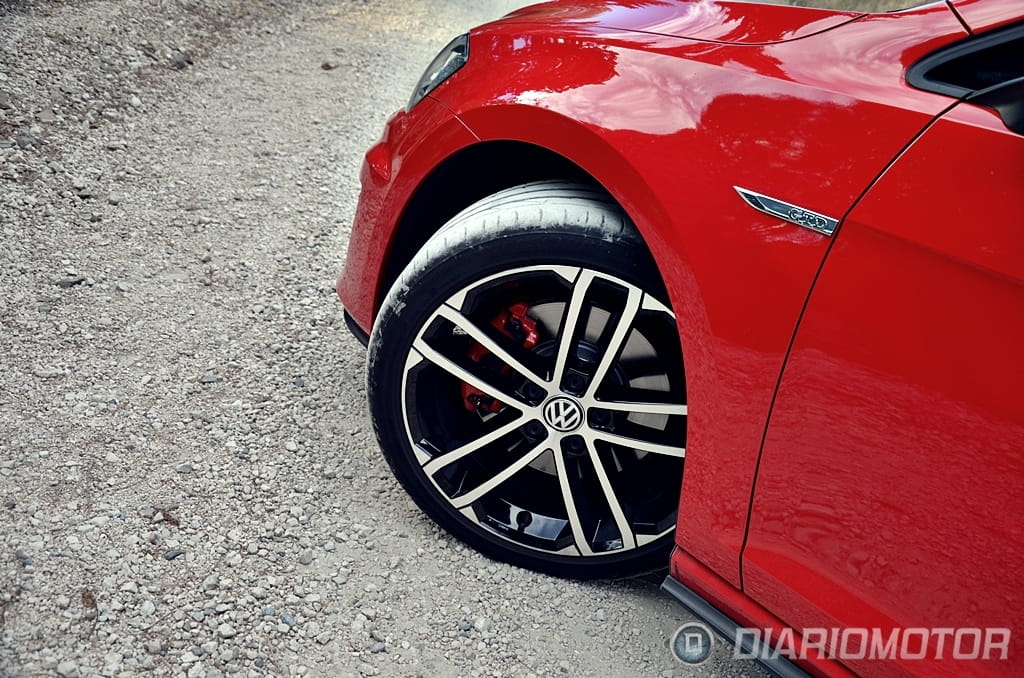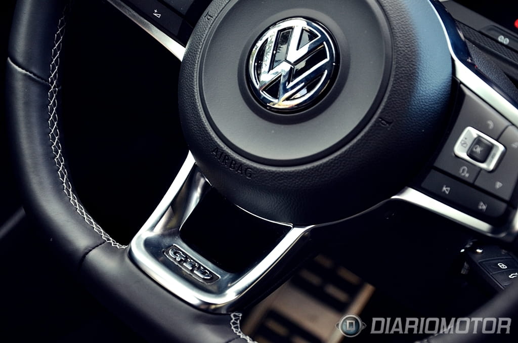 El “look” del Volkswagen Golf GTD apenas difiere del Volkswagen Golf GTI, un punto donde el GTD ha ganado enteros y en el que los profanos se las verán y desearán para hallar las diferencias. Tapicería de cuadros exclusiva con costuras en gris y negro frente al rojo del GTI, franja cromada entre faros frente al listón rojo del GTI y doble salida de escape lateral frente a escapes independientes en el GTI son los cambios que revelan de que variante hablamos. Esta unidad además añade llantas específicas “Nogaro” en 18” y acabado brillante a través de la selección del paquete Sport & Sound.