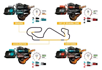 Y ahora probablemente te estarás preguntando cuál será la labor del piloto en todo este sofisticado engranaje. Para empezar, el funcionamiento de la mecánica será completamente transparente para el piloto, que únicamente tendrá que centrar sus esfuerzos en conducir y hacerlo lo mejor posible, pero sí que existirán modos de conducción que alterarán el comportamiento de la centralita y un modo específico que entregue toda la potencia en un momento oportuno, por ejemplo para realizar un adelantamiento.