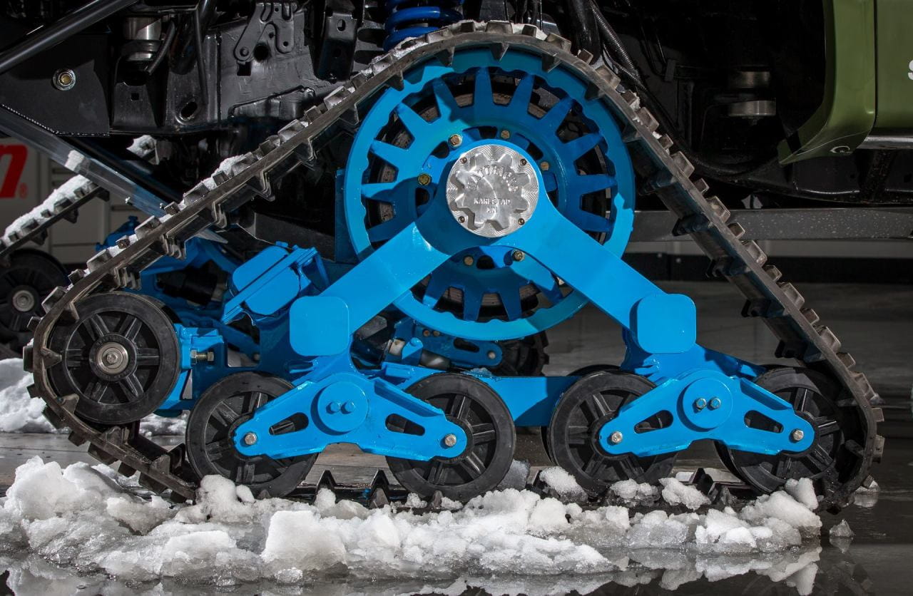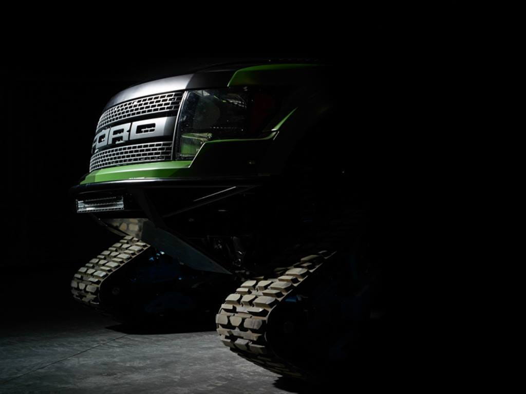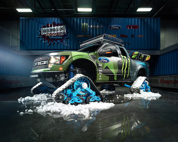 Para ello, el bueno de Ken Block envió su encargo a la empresa, también californiana, Special Vehicle Concepts, que se encargaría de transformar un Ford F-150 de serie en un ágil todoterreno para la nieve adosando cuatro grupos de orugas en el lugar en el que habitualmente deberíamos encontrarnos cuatro ruedas con sus correspondientes neumáticos.