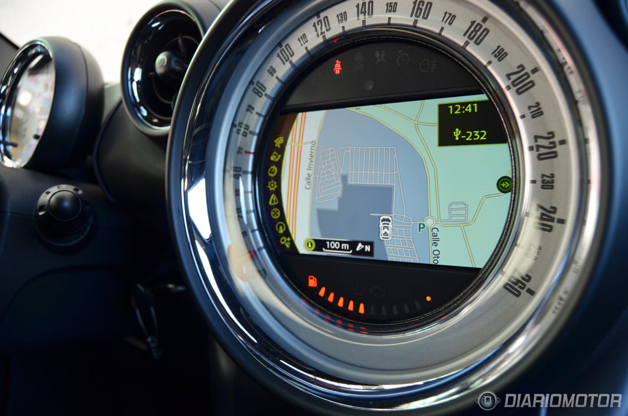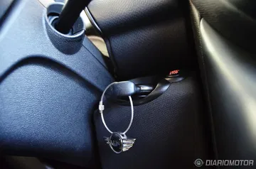 Hora de ponernos en marcha. Al lado derecho del volante una ranura para la peculiar llave redondeada del MINI. Presionamos y el bloque diésel de 143 caballos se pone en marcha, contando en su interior con un buen aislamiento tanto al ruido del bloque diésel como a las vibraciones de este, aunque el confort que transmite en esa primera puesta en marcha queda algo mitigado cuando pasamos por un resalto o algún desperfecto de la calzada y el conjunto de suspensiones duras y neumáticos run-flat vuelve a hacer acto de presencia. Más allá de esta pega el confort queda asegurado en vías rápidas con una correcta insonorización.