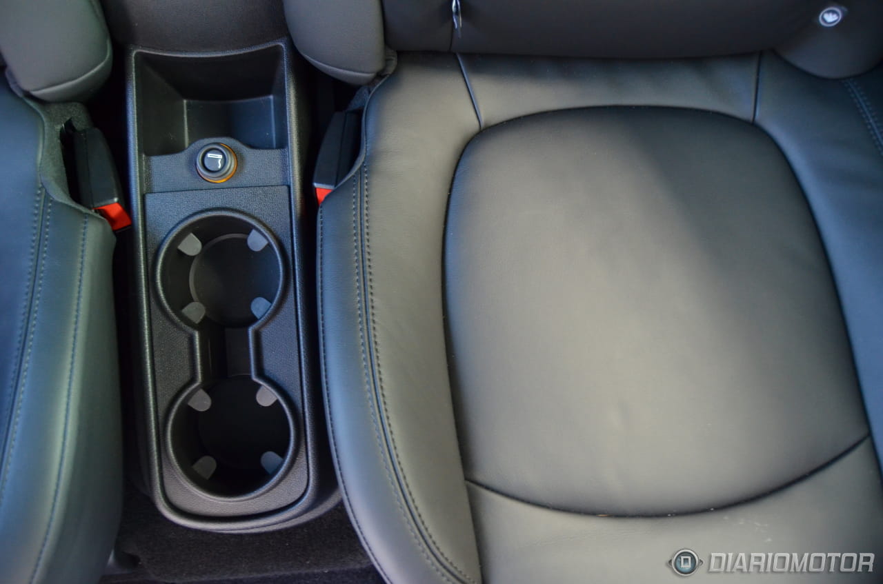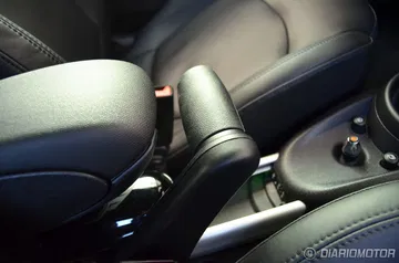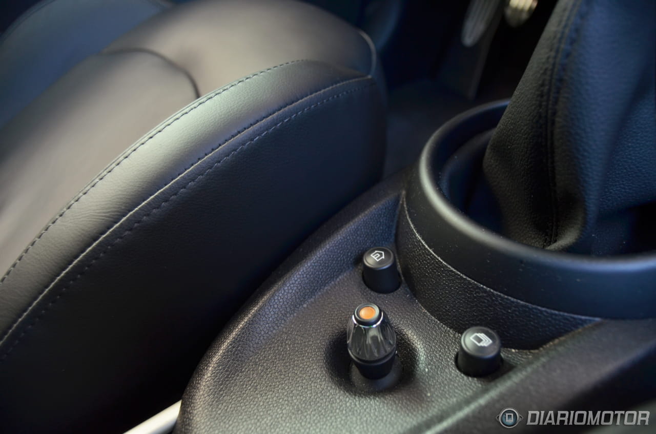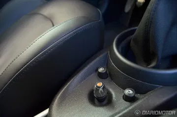 Más allá de la consola central nos encontramos con un puente central al que MINI ha denominado “Centre Rail”, prolongable hasta las plazas traseras con un acabado en aluminio y listo para alojar diferentes tipos de elementos portaobjetos. En el caso de la unidad probada este rail de aluminio no superaba las plazas delanteras situándose sobre él el reposabrazos central, culminando con este puente los botones de control de la pantalla central, el freno de mano (de un particular diseño) y dos espacios para bebidas, además de la toma USB para el sistema multimedia.