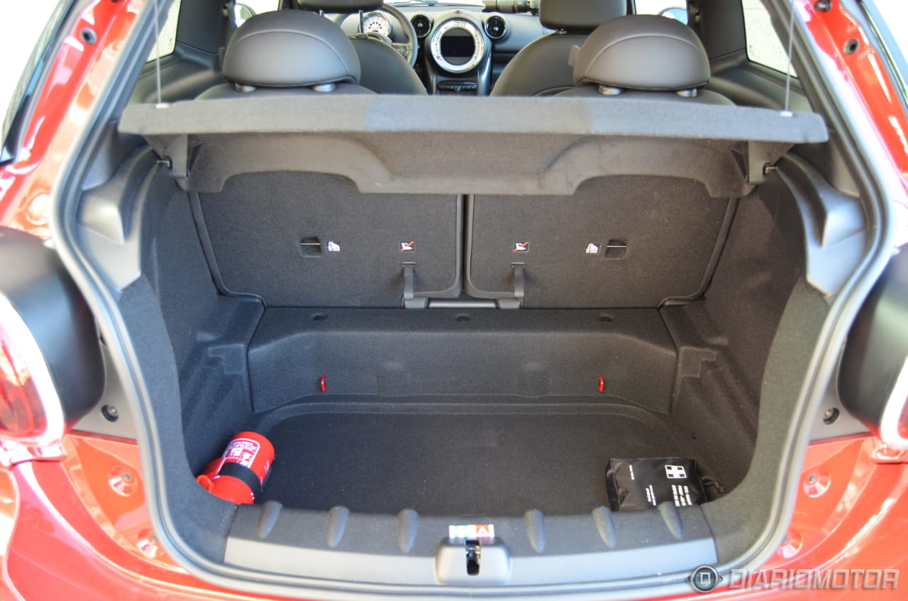 Respecto a su maletero, nos encontramos con un buen nivel de capacidad, en la línea de nuevo de un compacto, contando con una capacidad de 330 litros (el Countryman cuenta con una capacidad de 350 litros) repartidos entre la parte superior, con una superficie recta y sin formas que dificulten la carga y un doble fondo, siendo los asientos traseros abatibles para lograr una capacidad superior a los 1.000 litros.
