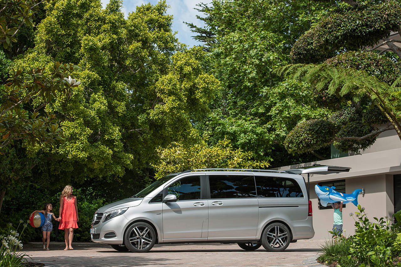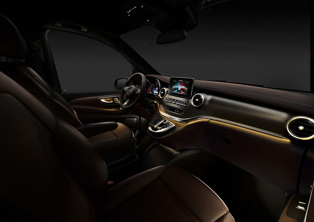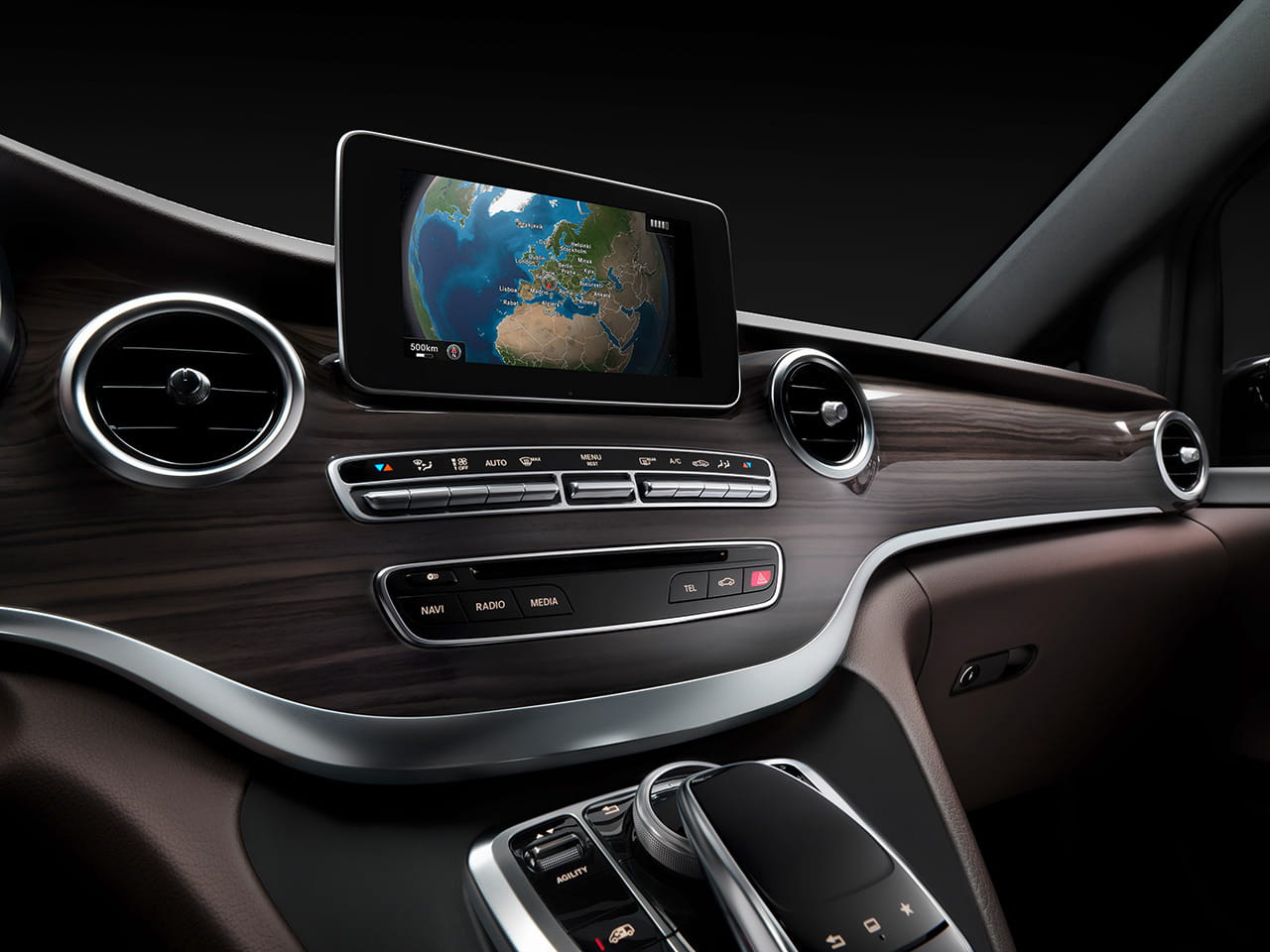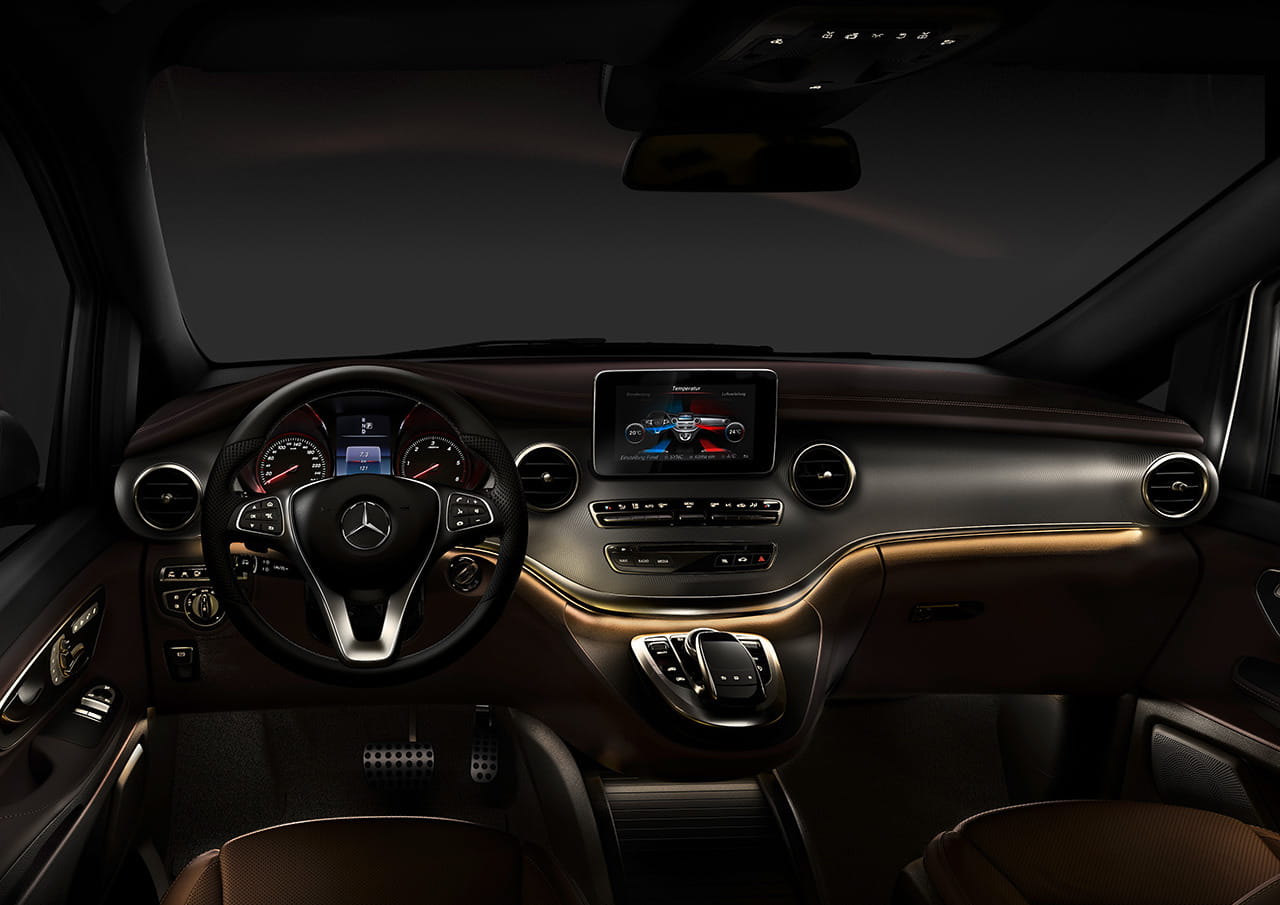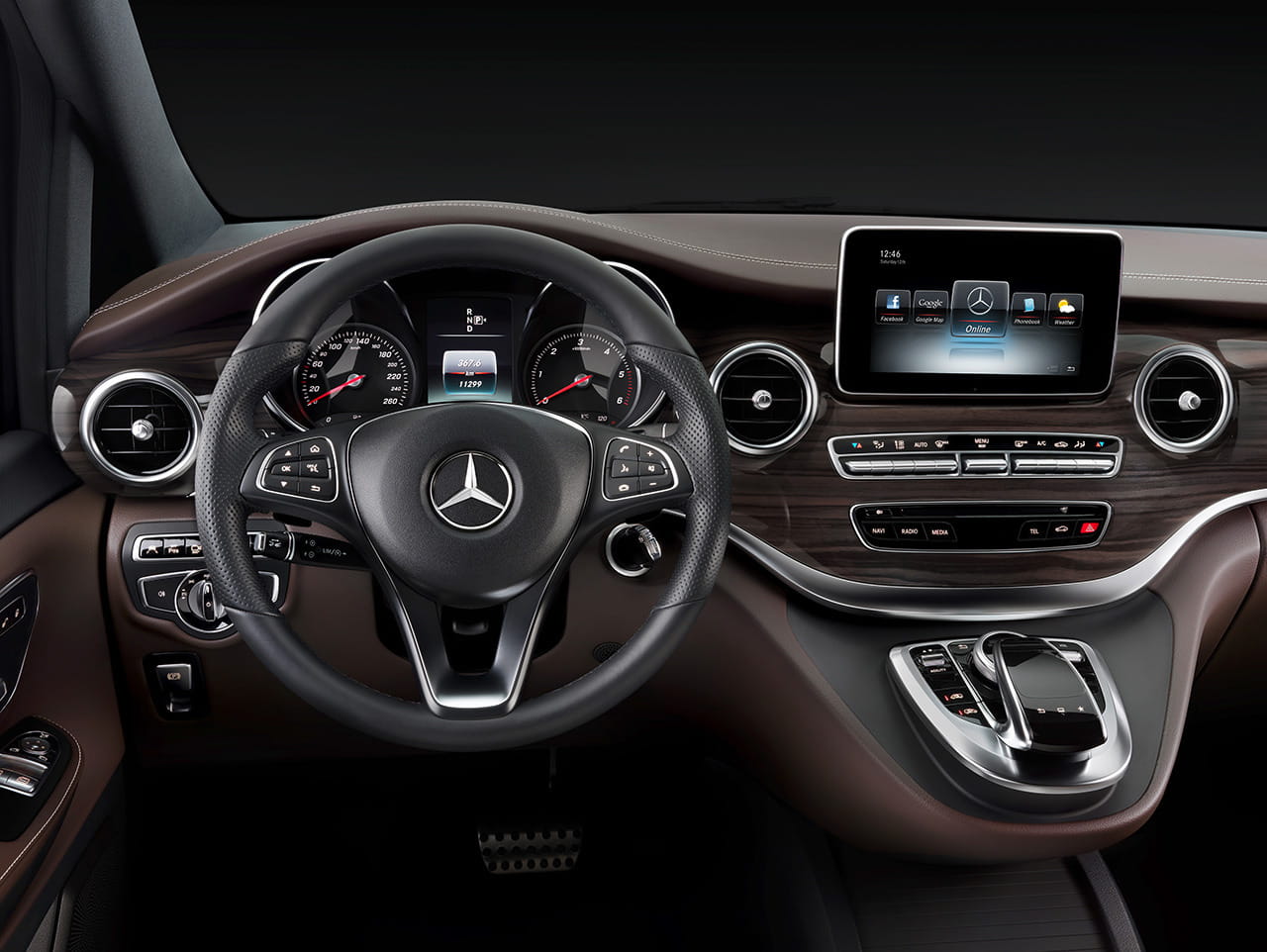 La Mercedes Clase V contará con numerosas ayudas a la conducción como ATTENTION ASSIST (aviso al conductor por pérdida de concentración), Crosswind Assist (que actúa sobre el ESP para detectar y corregir pérdidas de trayectoria por viento lateral), cámara de 360º, asistente de parking automático, una instrumentación completamente digital, un equipo multimedia con una gran pantalla pilotada por una interfaz satélite de tipo ratón, con sensibilidad táctil y acciones gestuales.