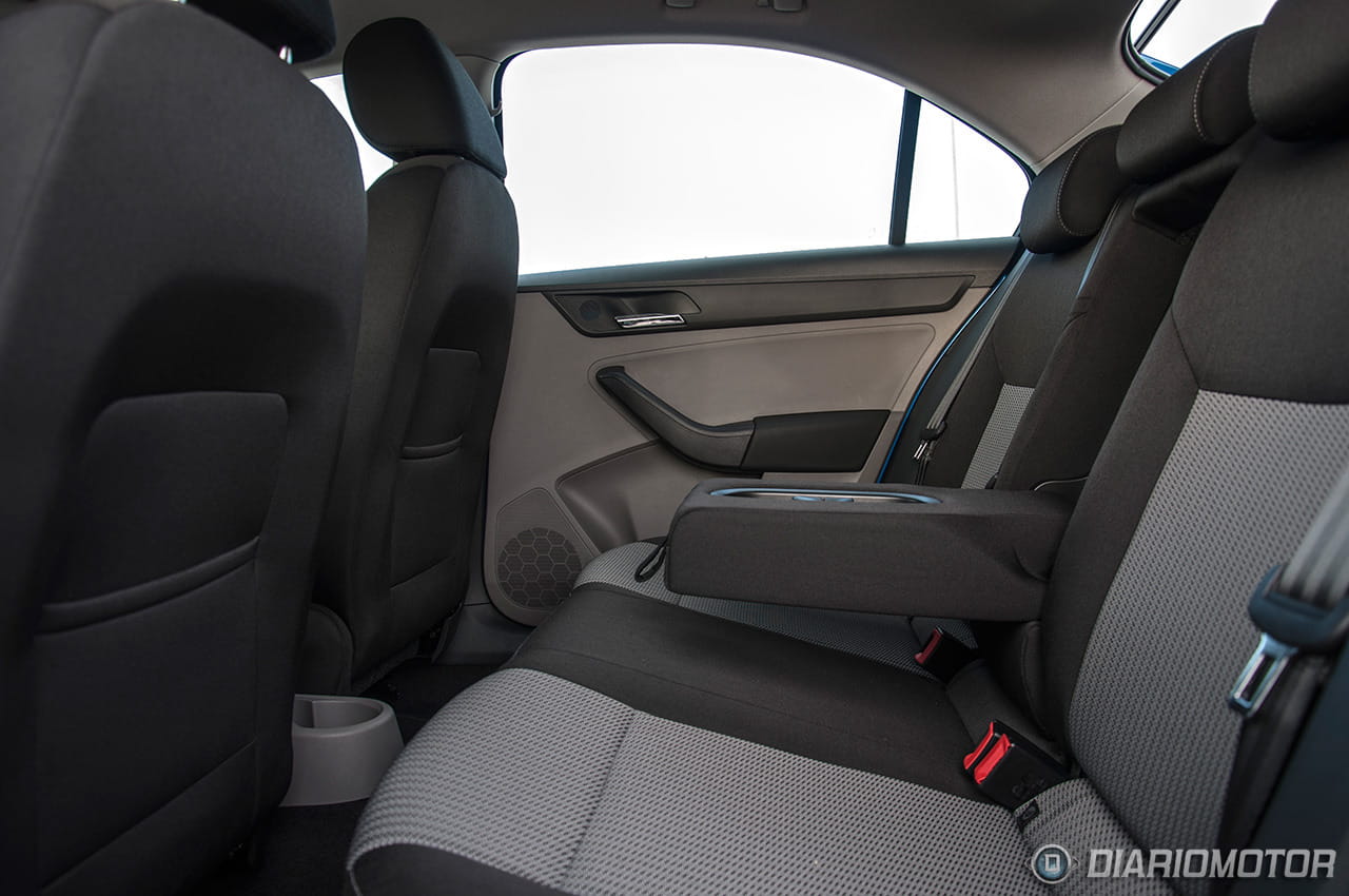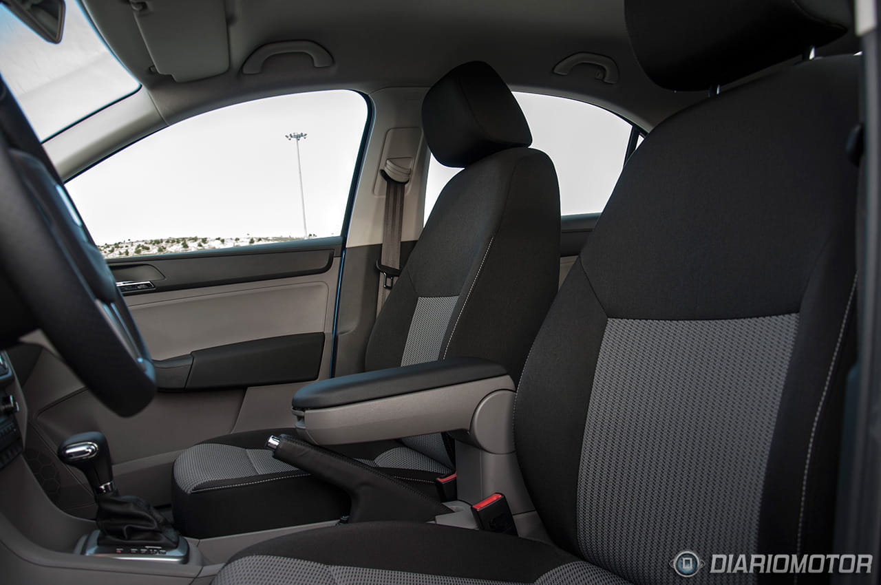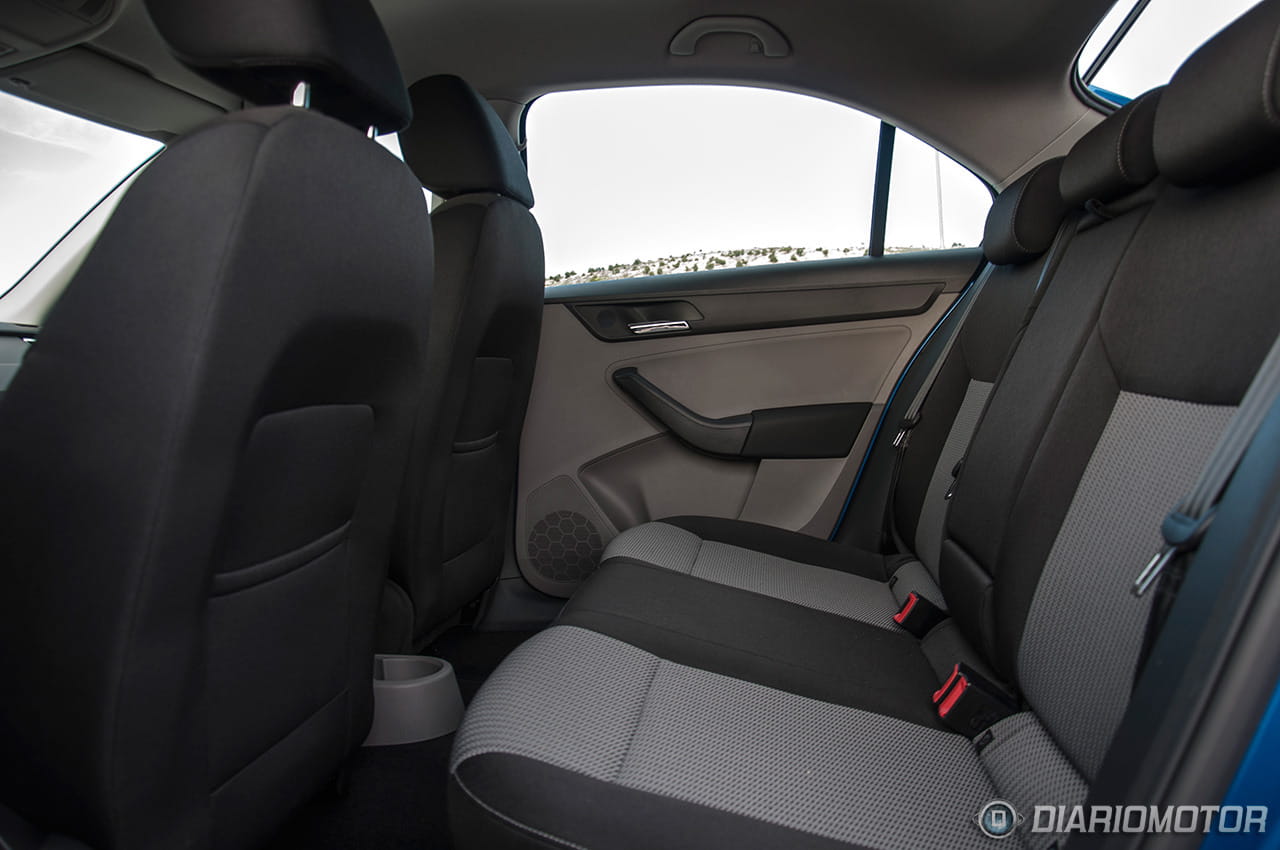 Los asientos de acceso a la gama SEAT Toledo y Skoda Rapid gozan de bastante mullido, pero no son todo lo cómodos que cabría esperar. En el caso del Skoda podemos optar a unos asientos, presentes en las versiones Dynamic, algo más ergonómicos, con buena sujeción lateral y un reposacabezas integrado en el propio respaldo y por lo tanto sin posibilidad de ajuste vertical. Incluso careciendo de ese ajuste, para un servidor que no levanta más de 1,70 metros del suelo, su ergonomía resultó óptima. Este detalle me gustó bastante tanto en el Rapid como en el Spaceback que probamos recientemente.