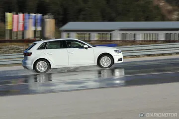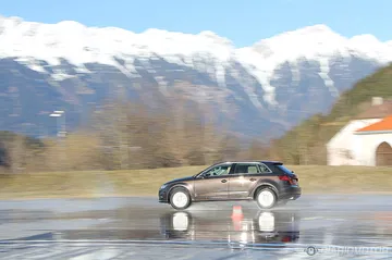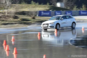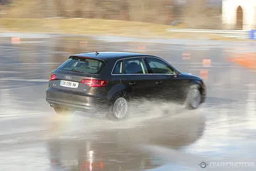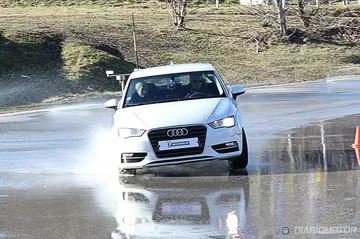 En la prueba de agarre en curva, un círculo horizontal convenientemente regado hasta el encharcamiento nos permite buscar el límite de adherencia lateral con toda seguridad, rodando alternativamente con neumáticos de invierno y verano (Michelin Alpin 5 y Michelin Primacy 3, respectivamente). Teniendo en cuenta que la temperatura estaba ya en el límite entre invierno y verano, nos queda la duda de lo que habría sucedido contra unos Pilot Sport, algo más orientados al agarre y algo menos a la duración.